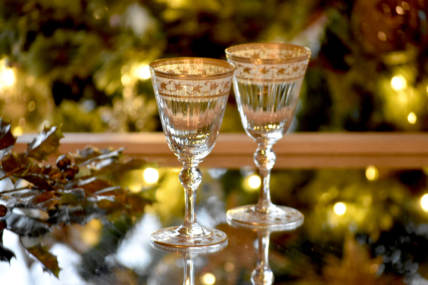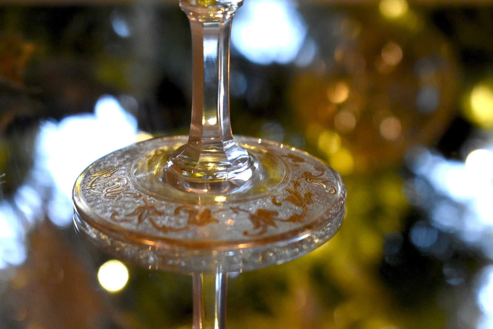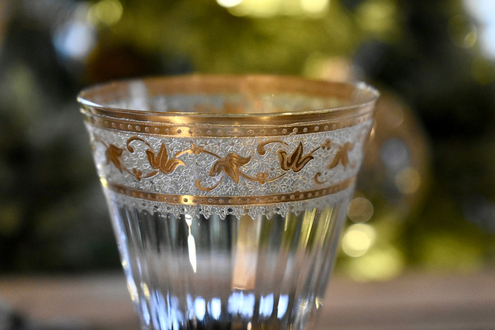 丁寧に施された細やかなアシッドエッチングと金彩が光を受けて浮かび上がり、さらにグラス内側には、コート・ヴェニシエンヌと呼ばれる特別な技法が用いられています。