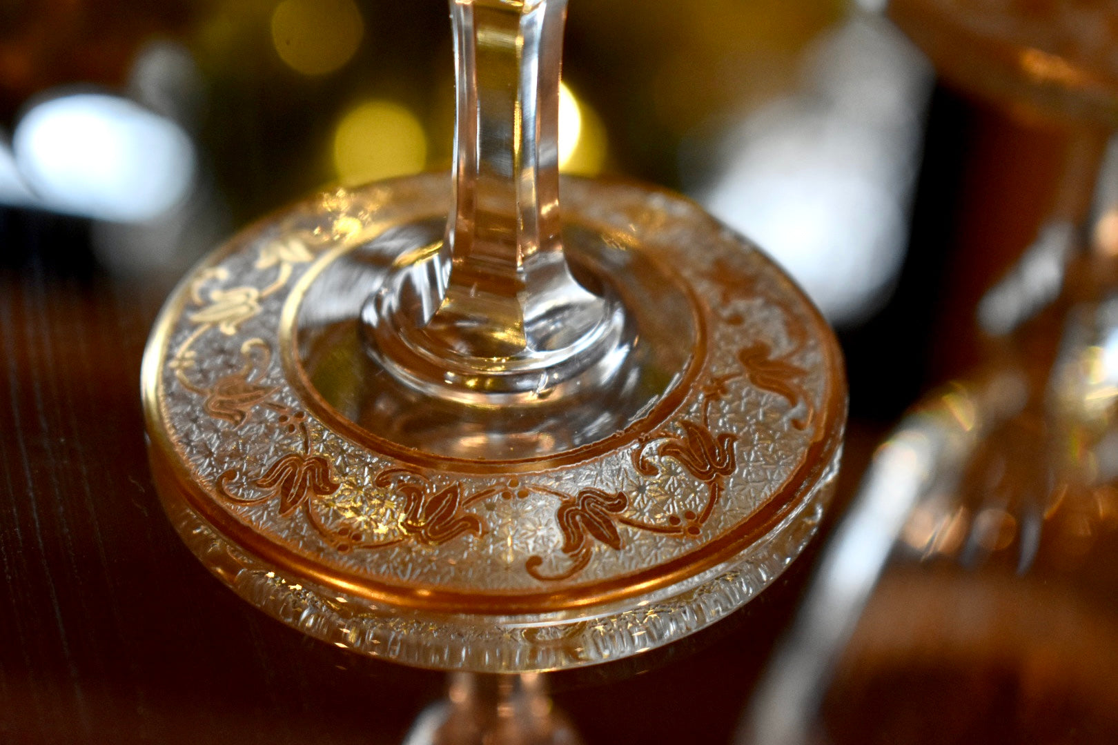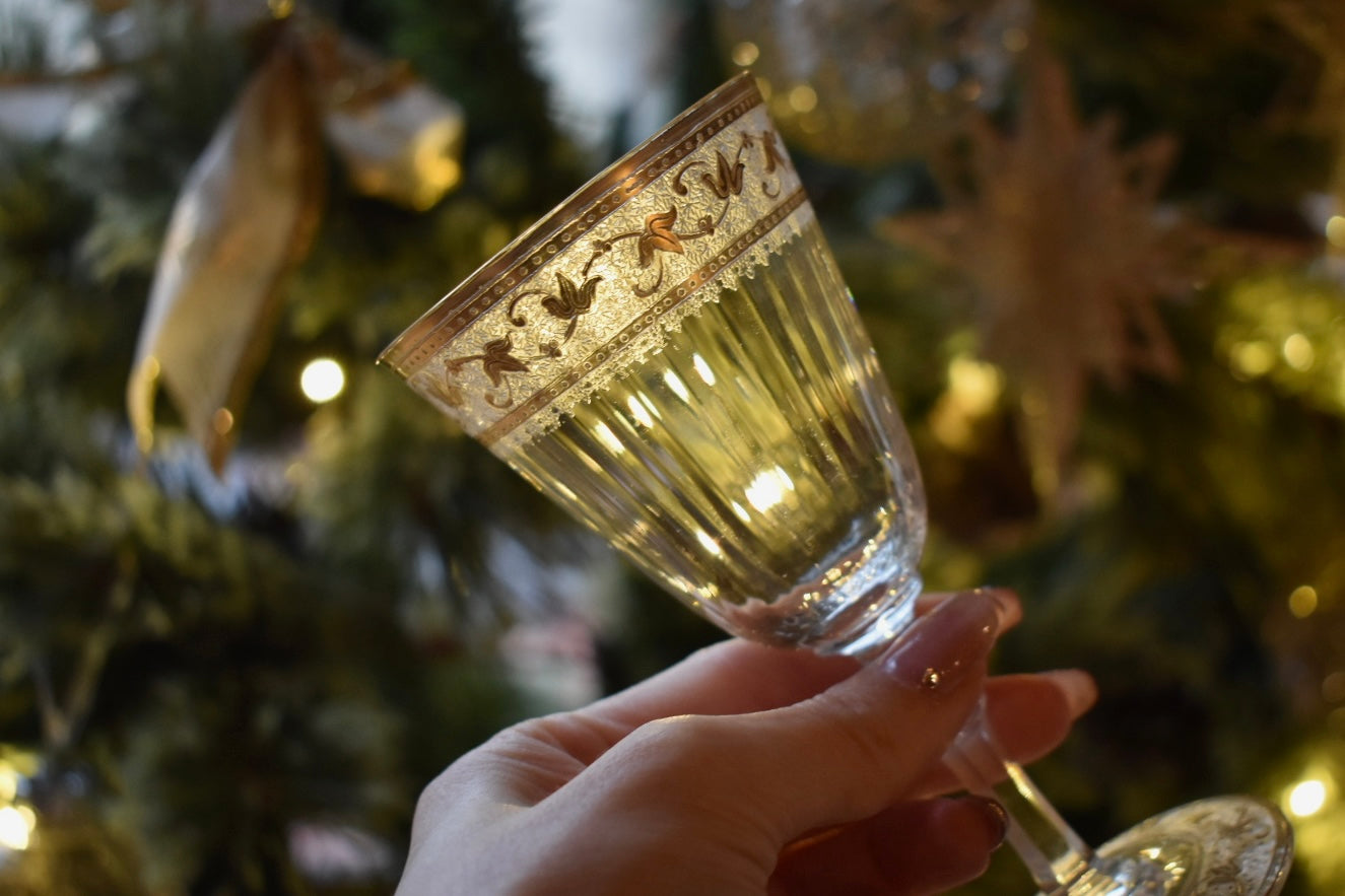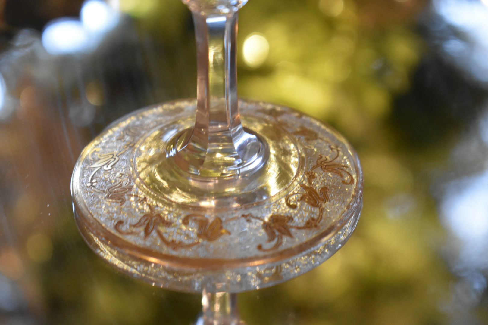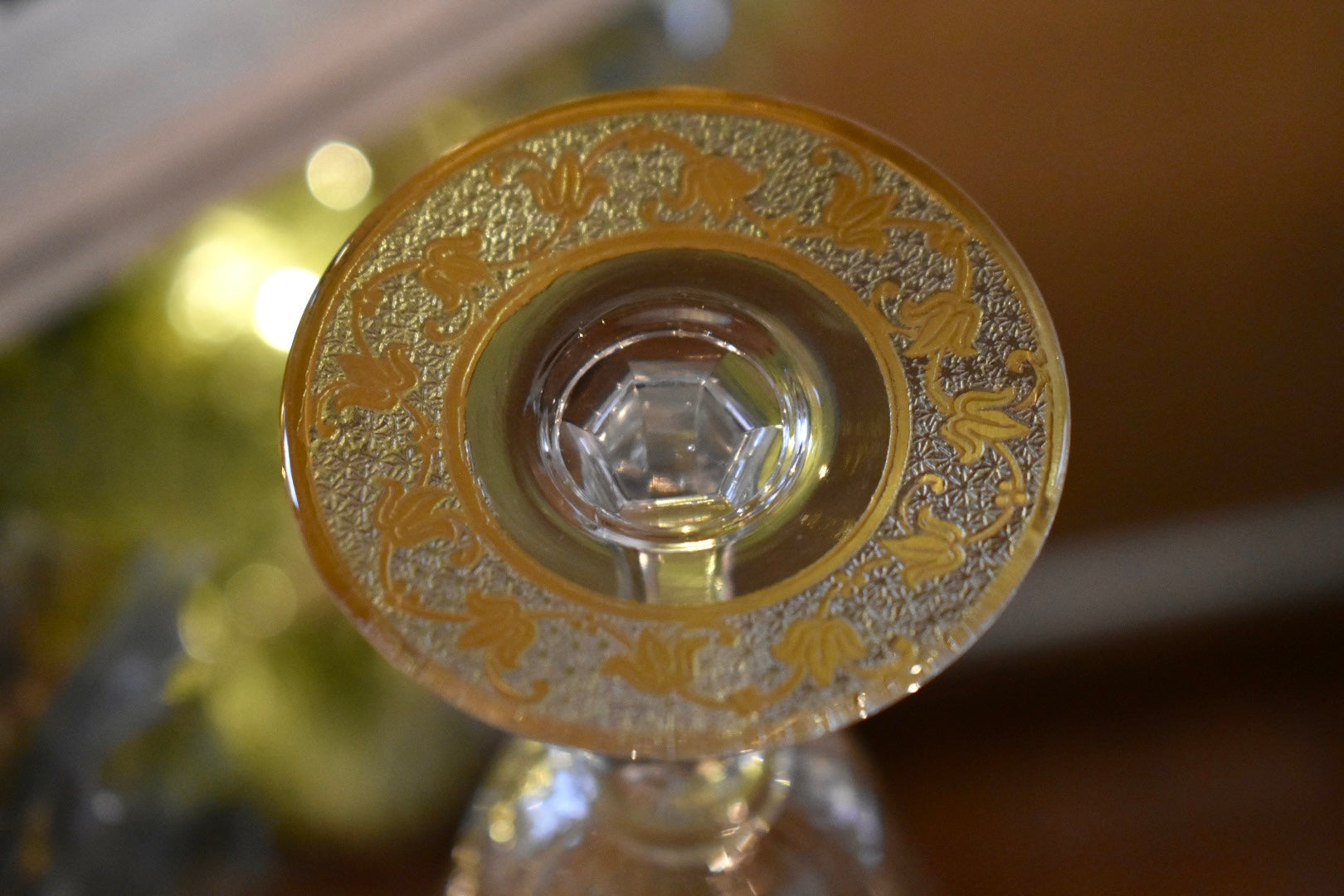 丁寧に施された細やかなアシッドエッチングと金彩が光を受けて浮かび上がり、さらにグラス内側には、コート・ヴェニシエンヌと呼ばれる特別な技法が用いられています。
