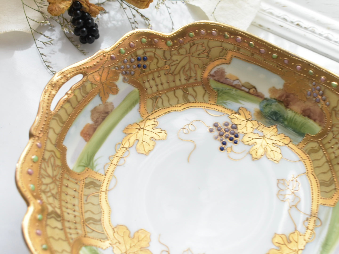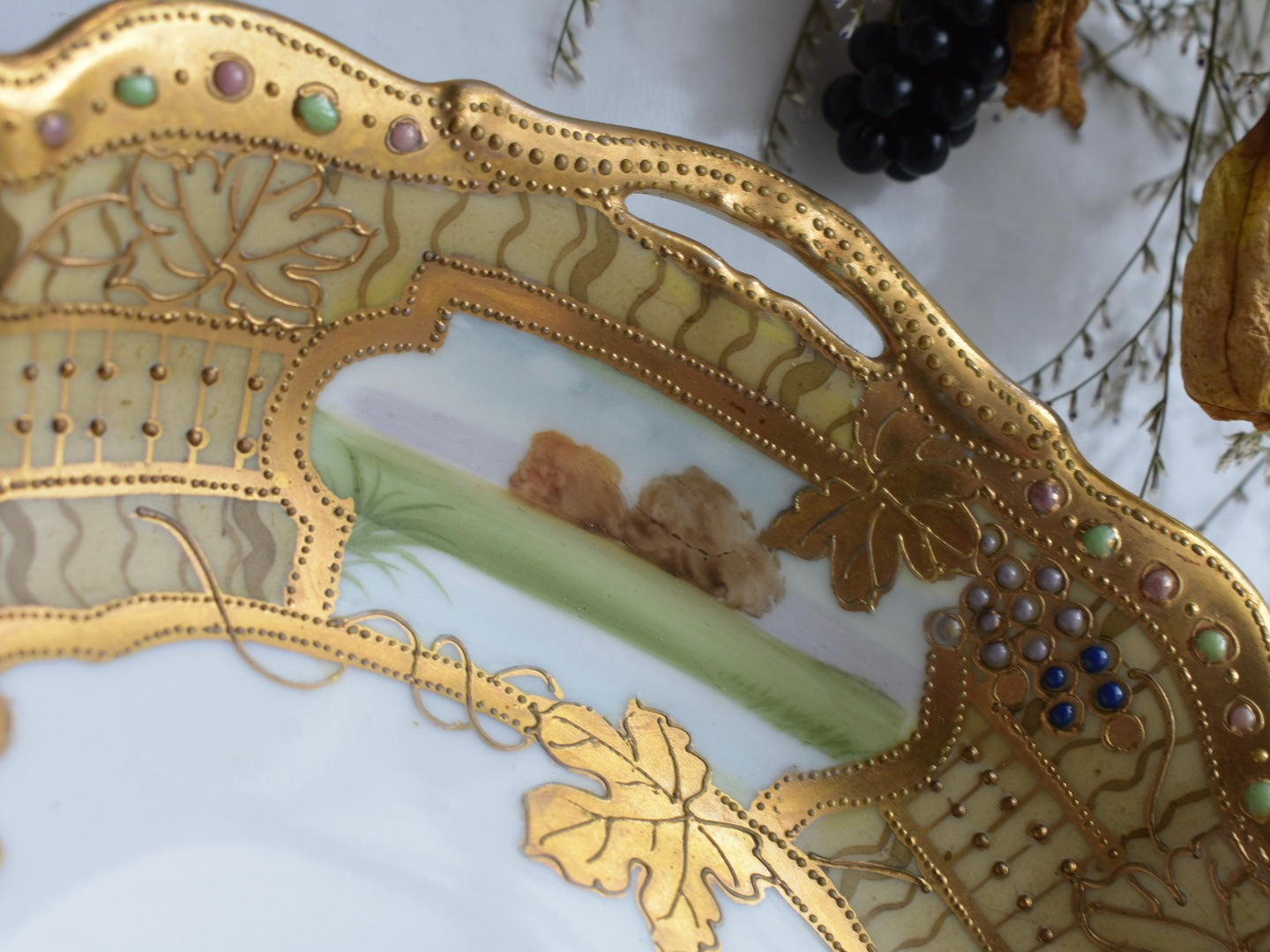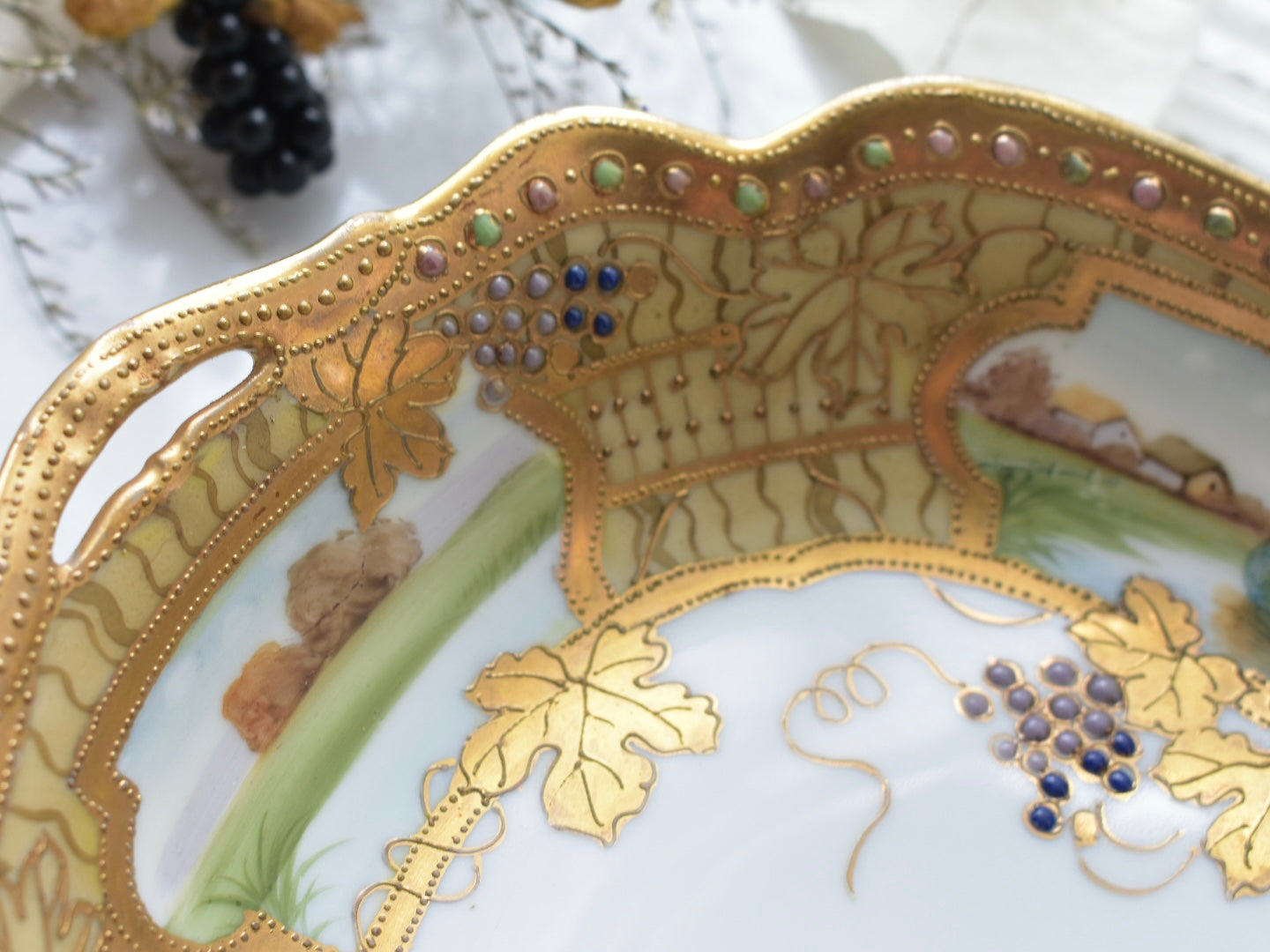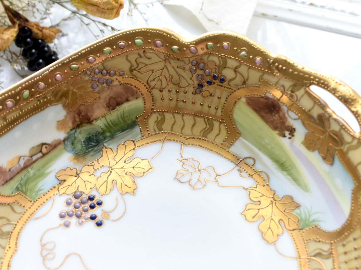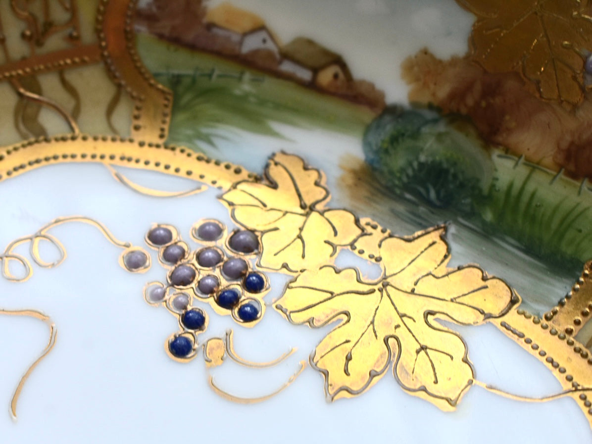 器の外縁には贅沢な金彩があしらわれ、四面には風景画が描かれています。そしてその景色の上に重ねられるように配された葡萄の葉と実が、深みを添えています。