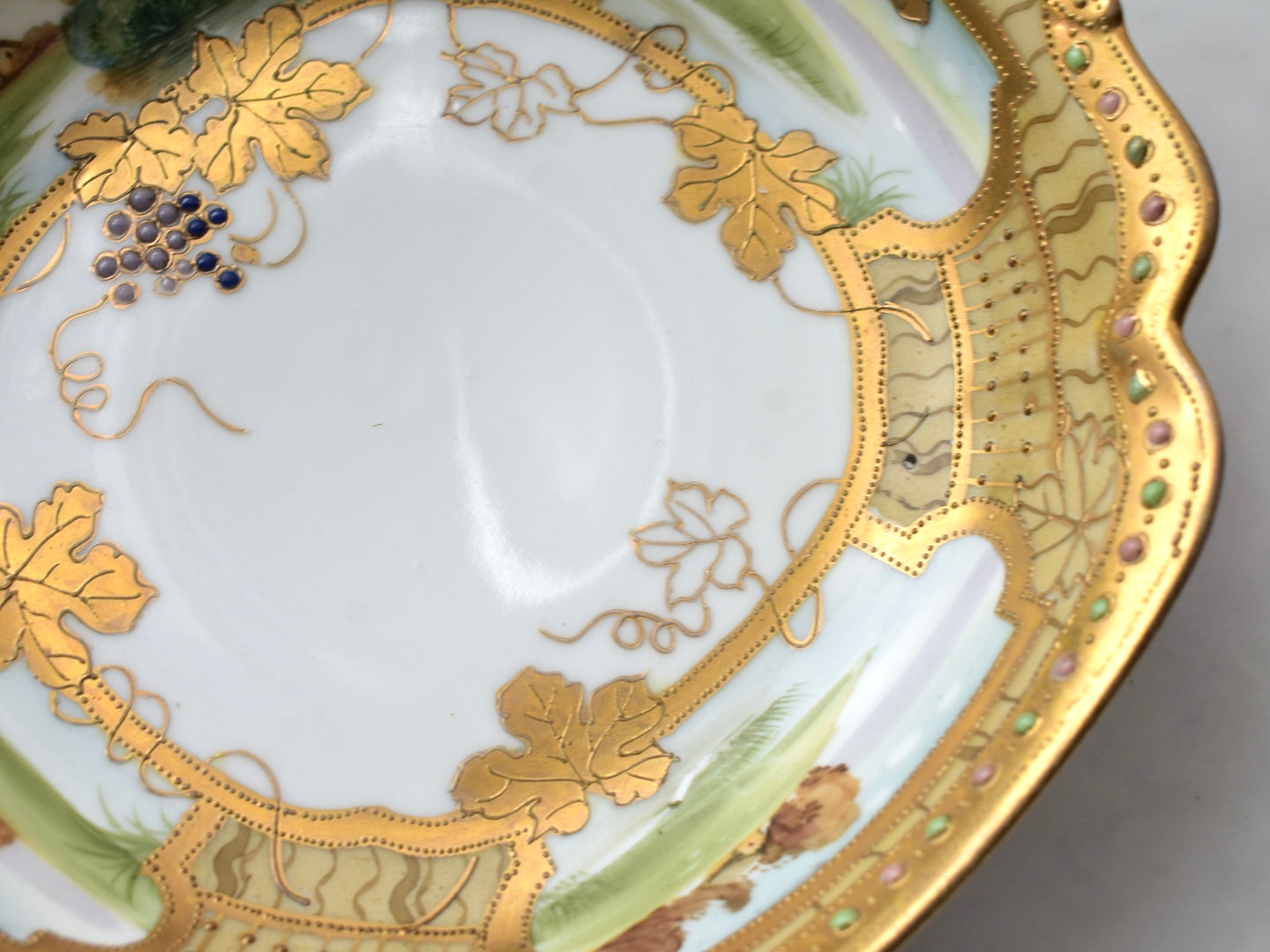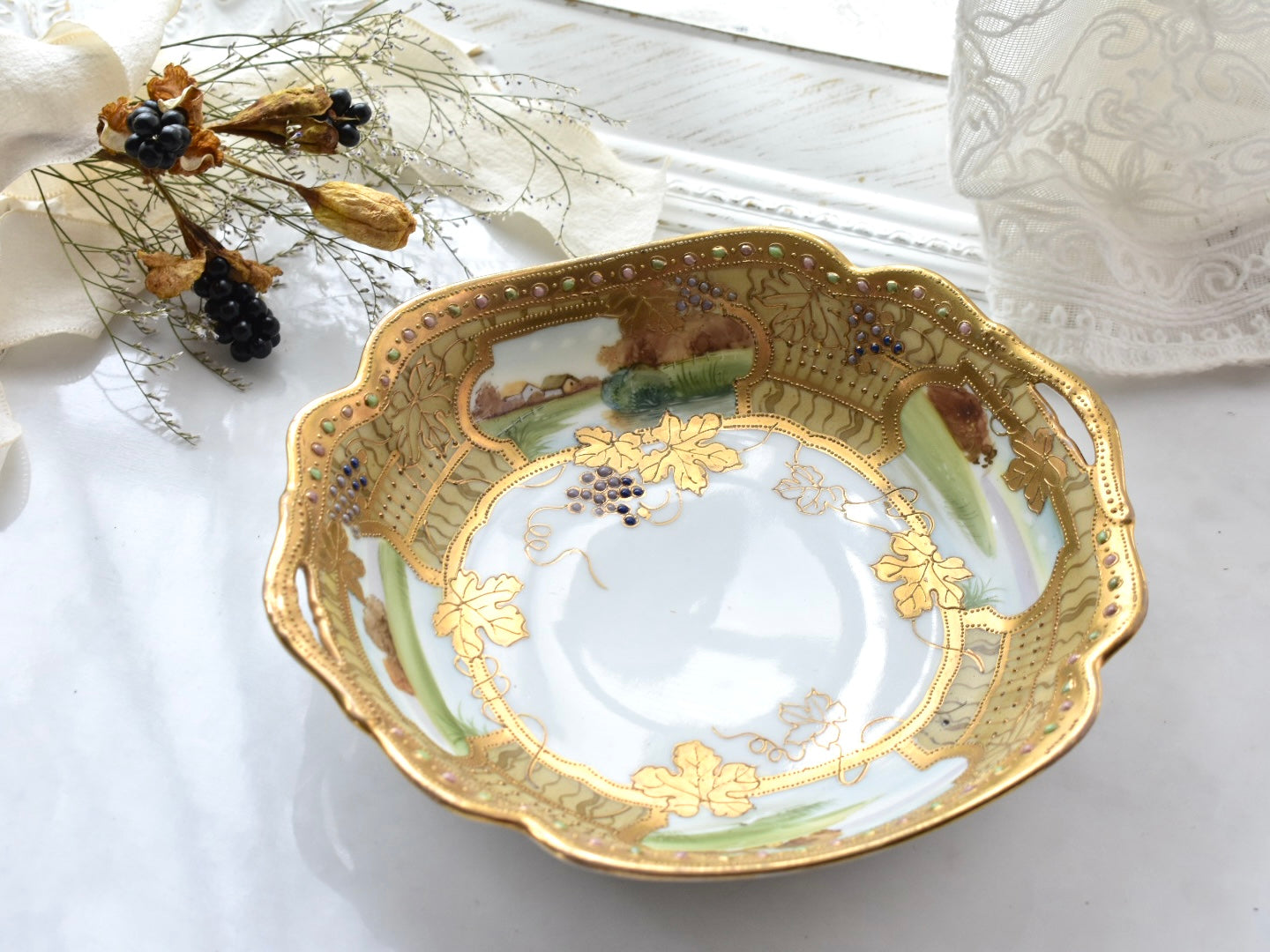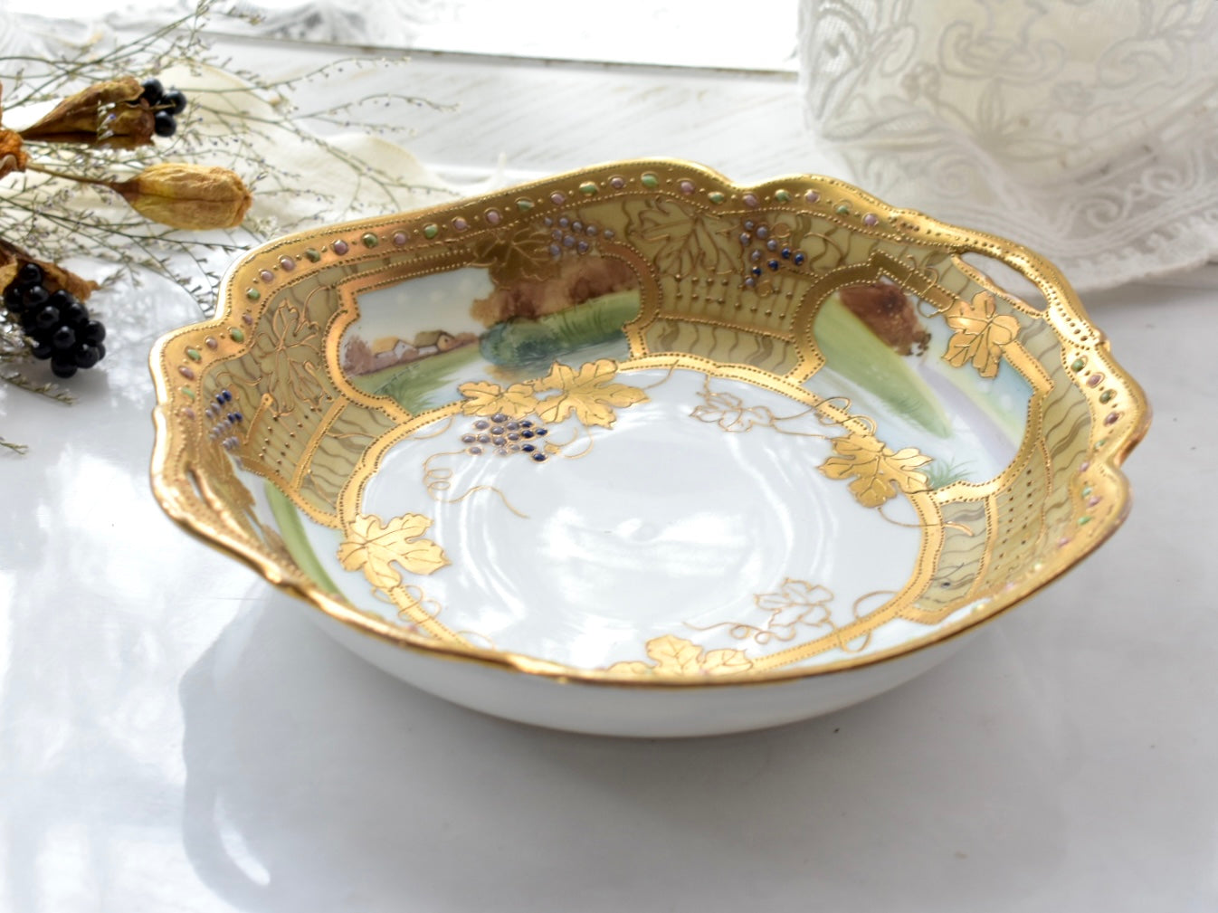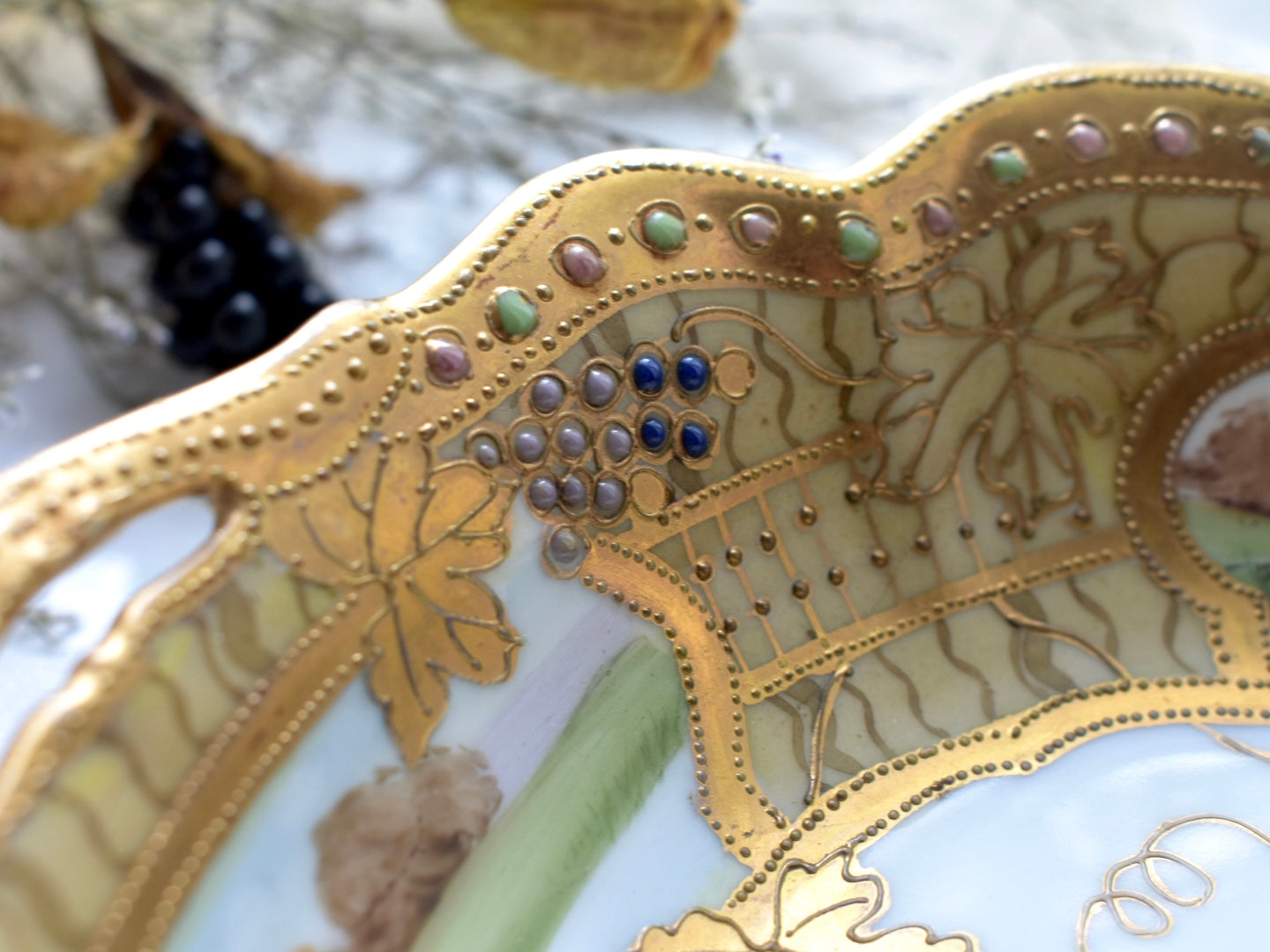 器の外縁には贅沢な金彩があしらわれ、四面には風景画が描かれています。そしてその景色の上に重ねられるように配された葡萄の葉と実が、深みを添えています。