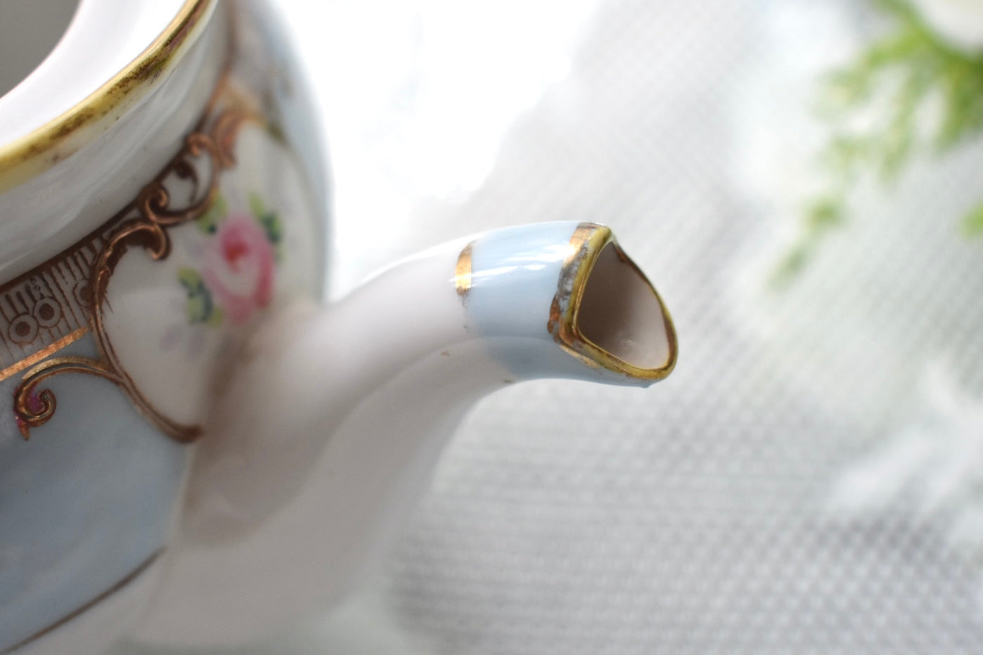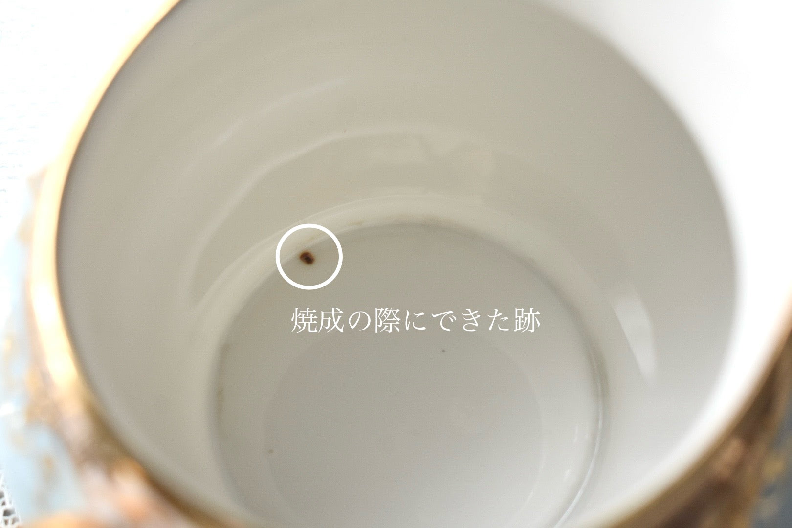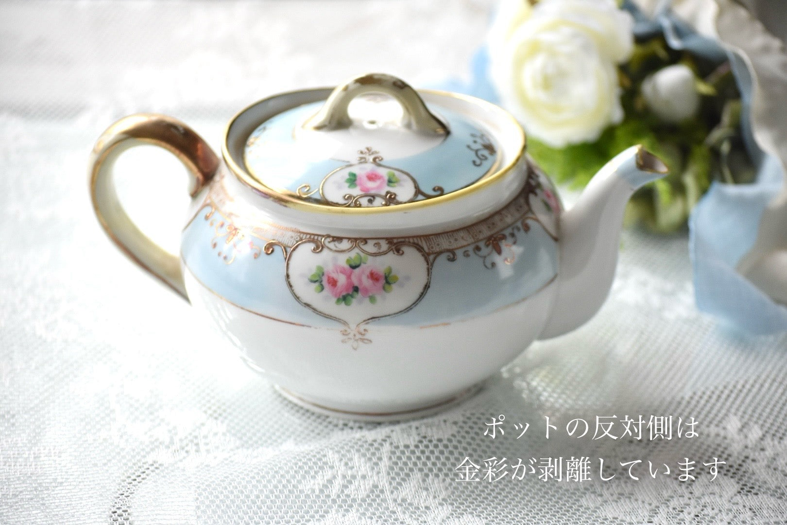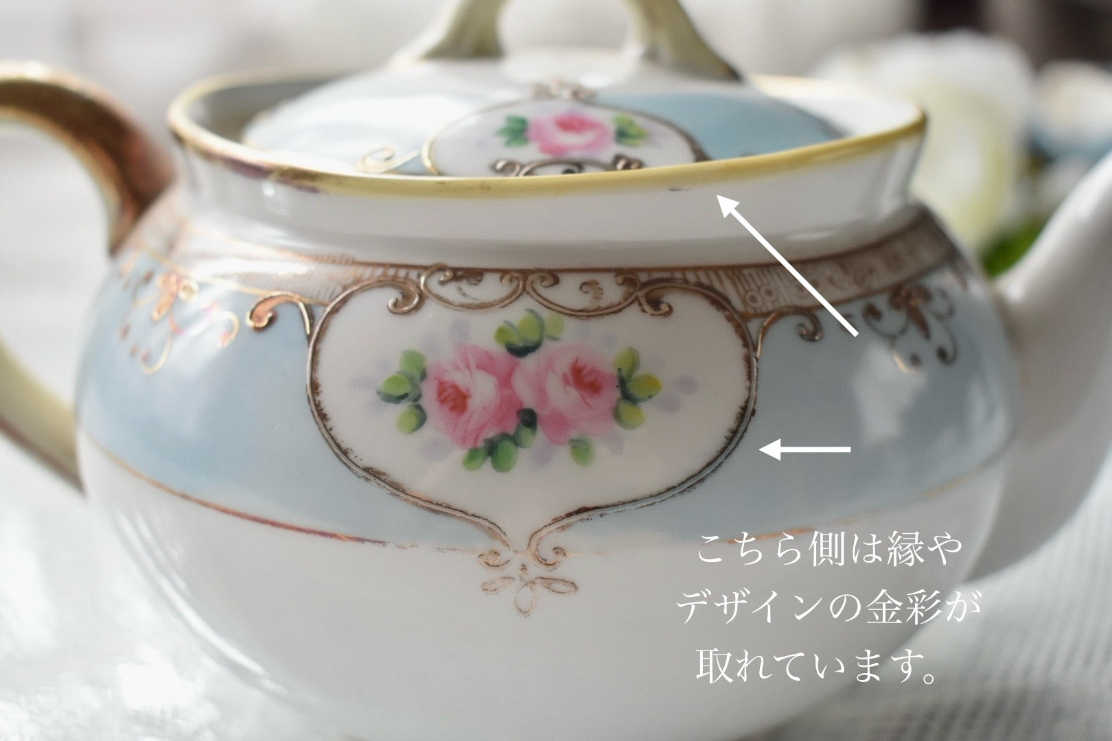 ポット:蓋の取手部分、ポットの縁に金彩の剥離が目立ちます。 一部下地の黄色い部分が出ております。
