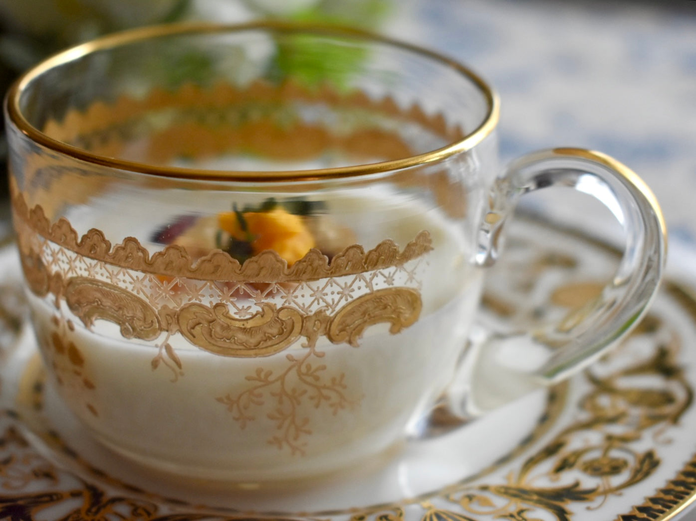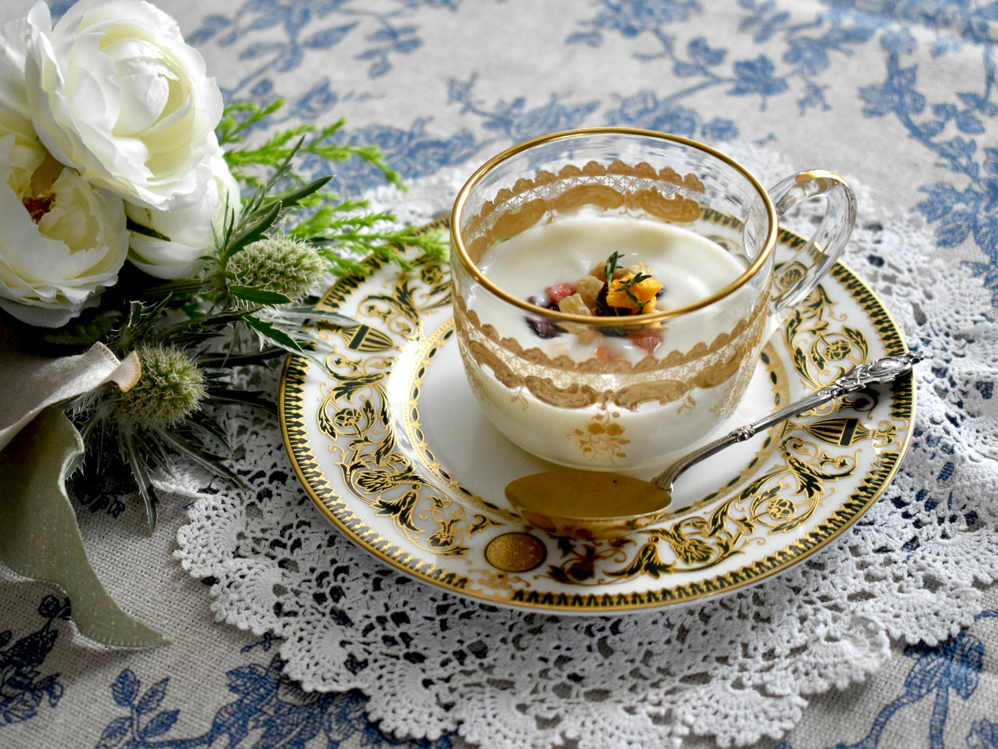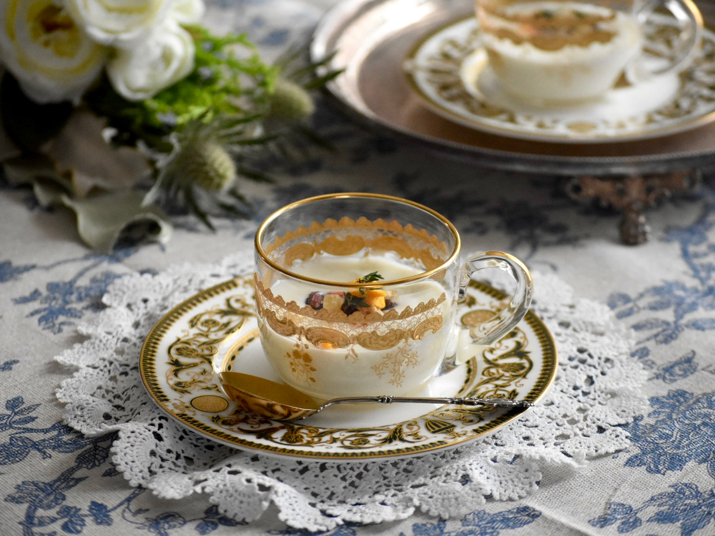 下図のようにお手持ちのソーサーに合わせてみても良いですし、大きめのディナープレートにも冷製のスープを入れて使っていただくこともできます。