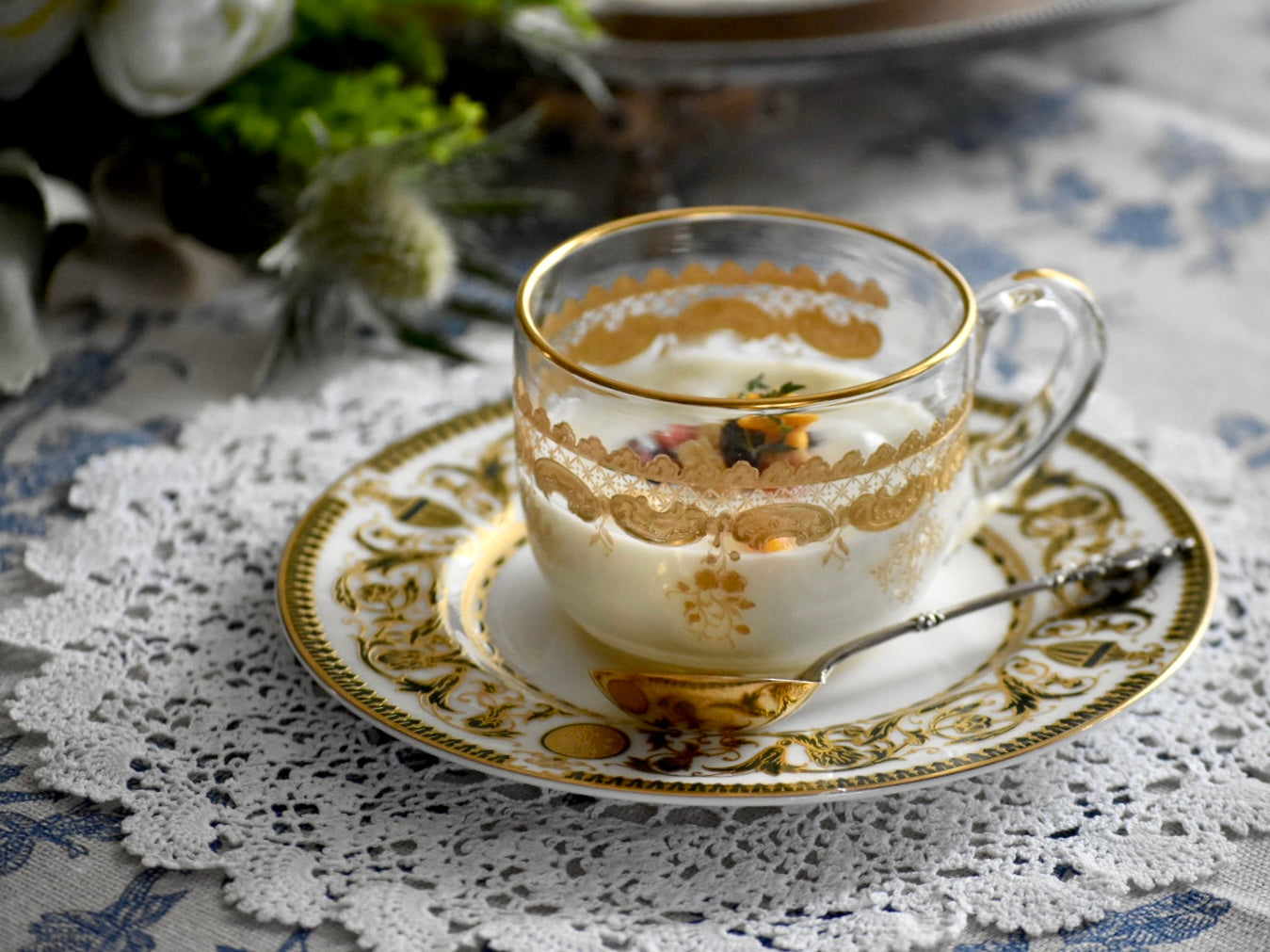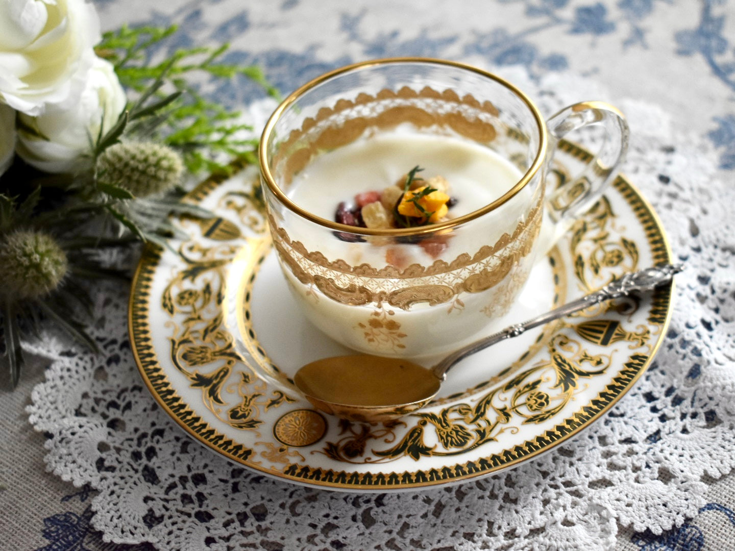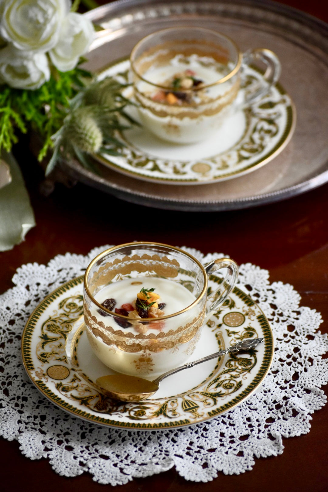 下図のようにお手持ちのソーサーに合わせてみても良いですし、大きめのディナープレートにも冷製のスープを入れて使っていただくこともできます。