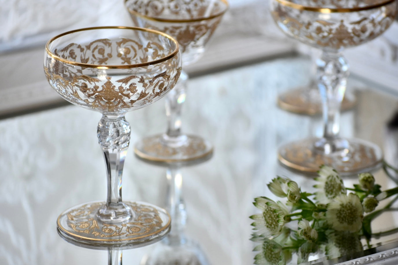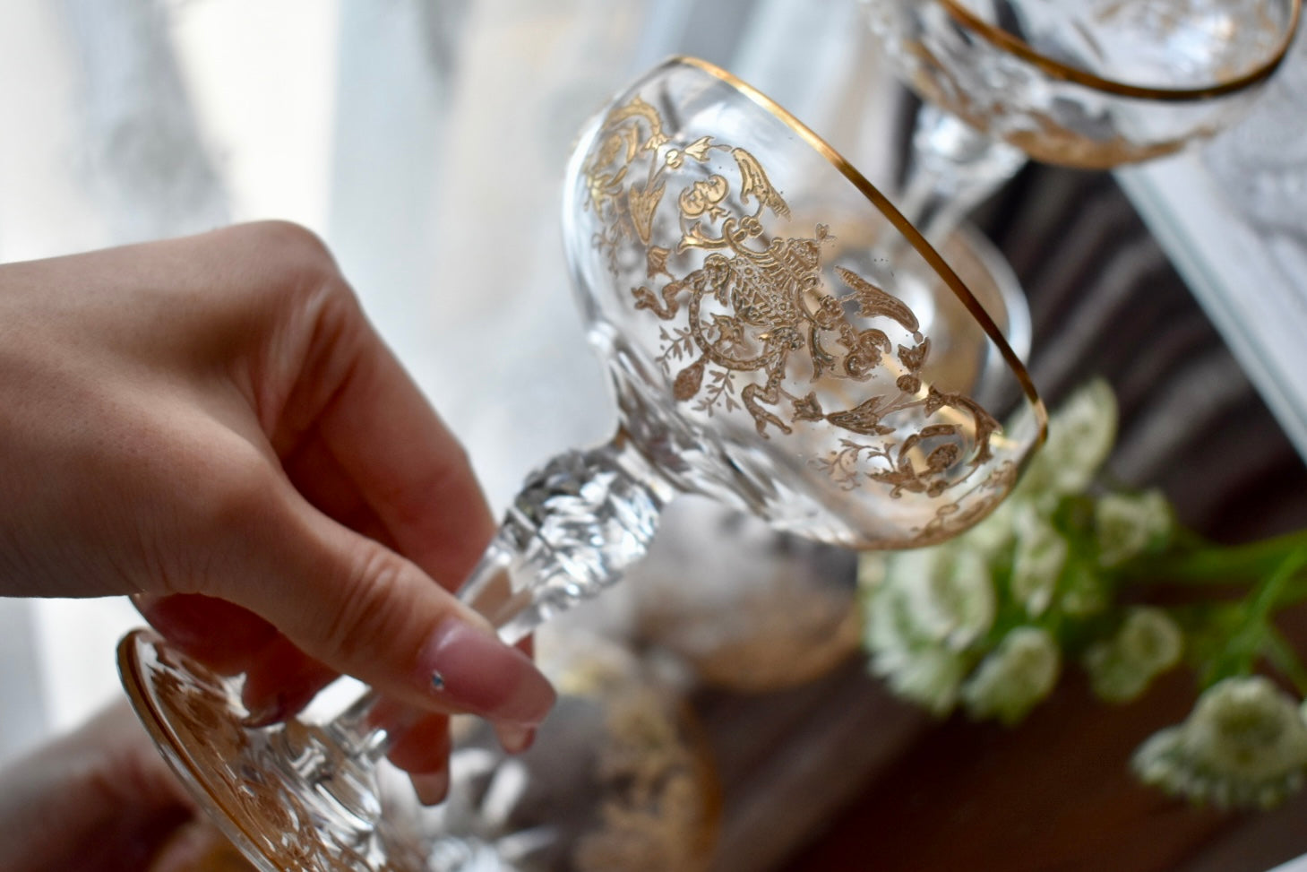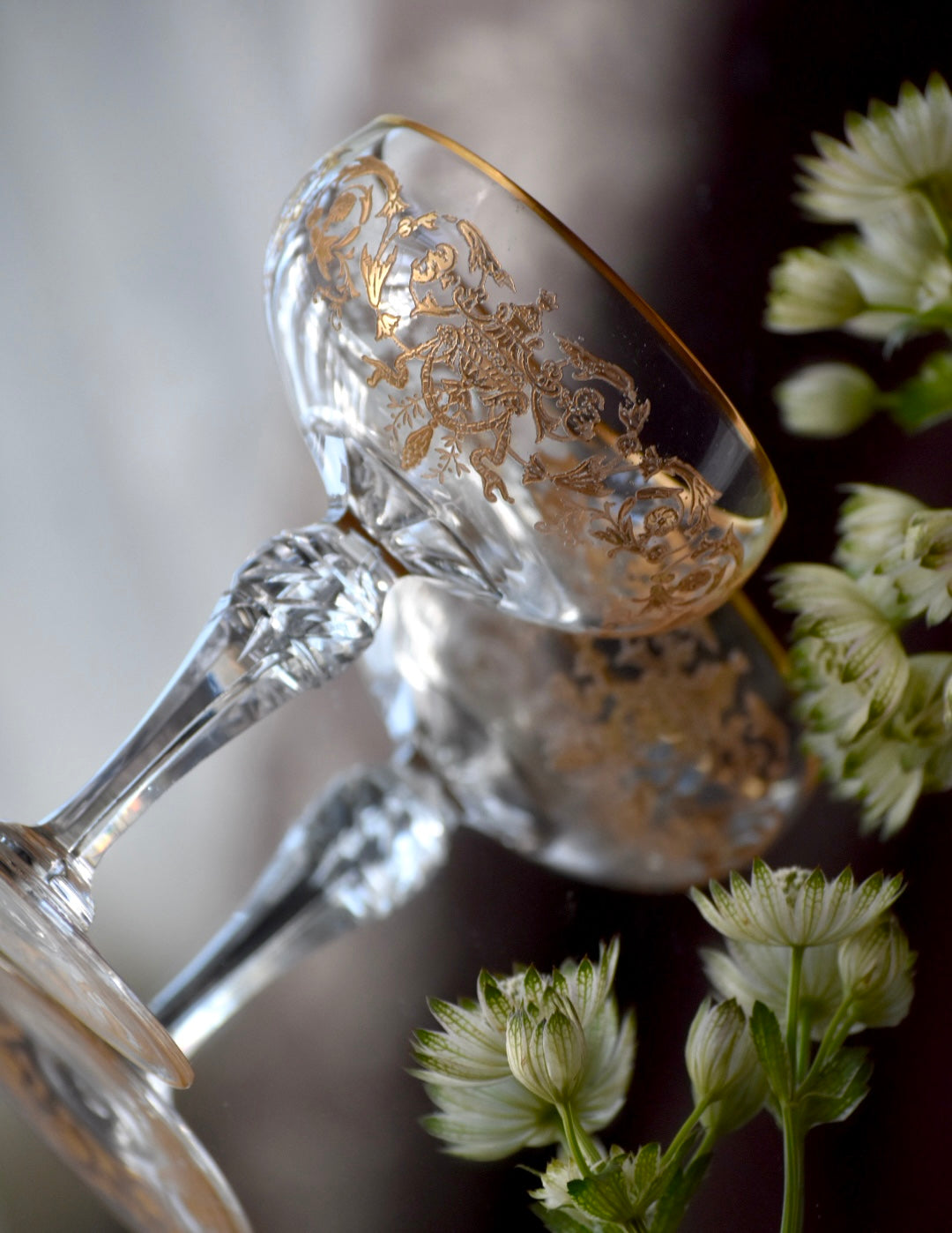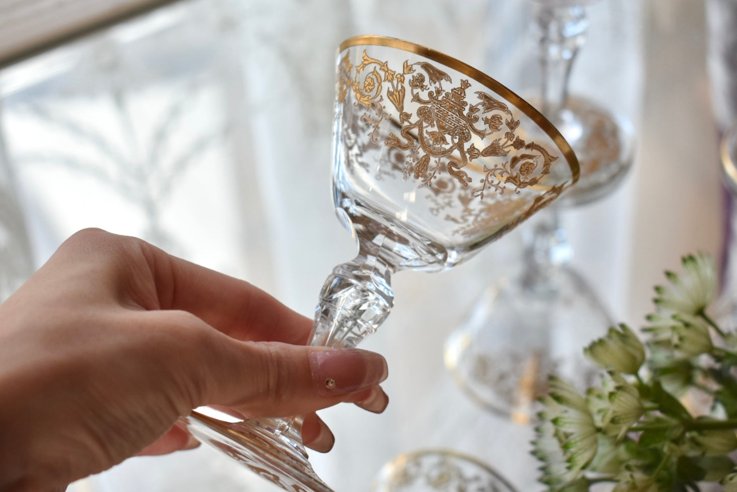 砂糖が貴重とされた時代、フルーツをシャンパンに浸して楽しんだり、所作が美しく見えるグラスは貴婦人にとても愛されました。