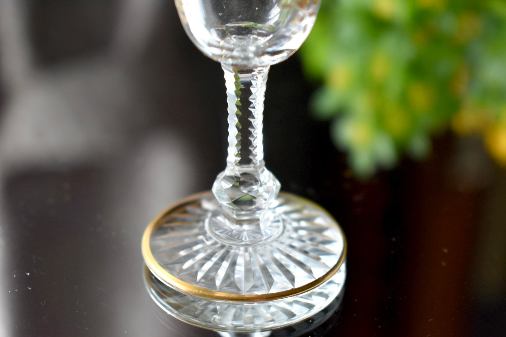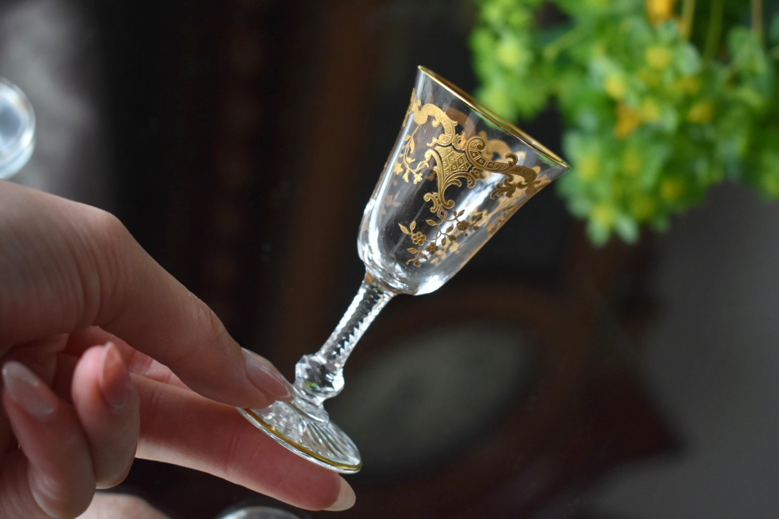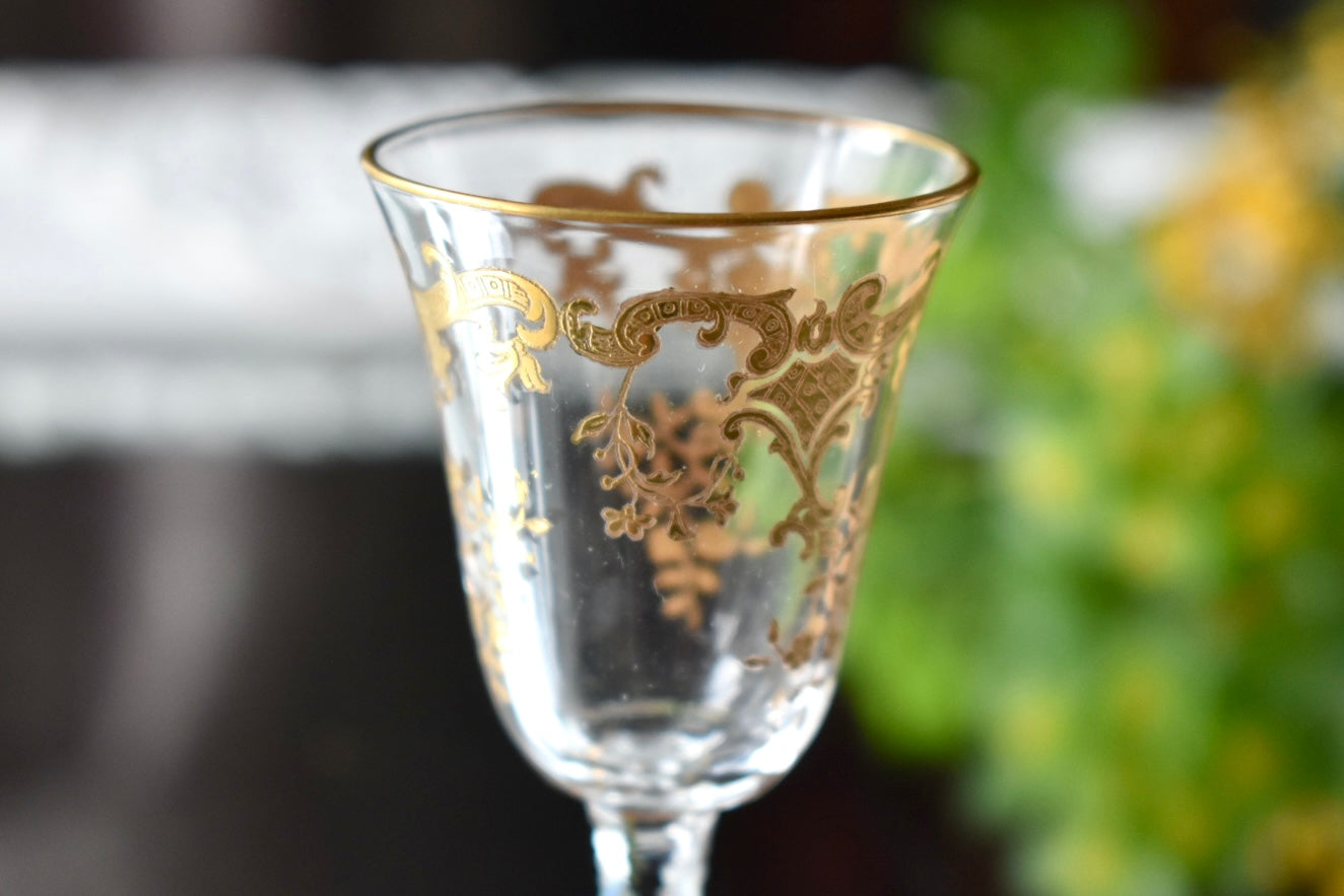 いかにもサンルイらしい、ステムに施された繊細なカッティングと金彩の装飾が美しいリキュールグラスです。