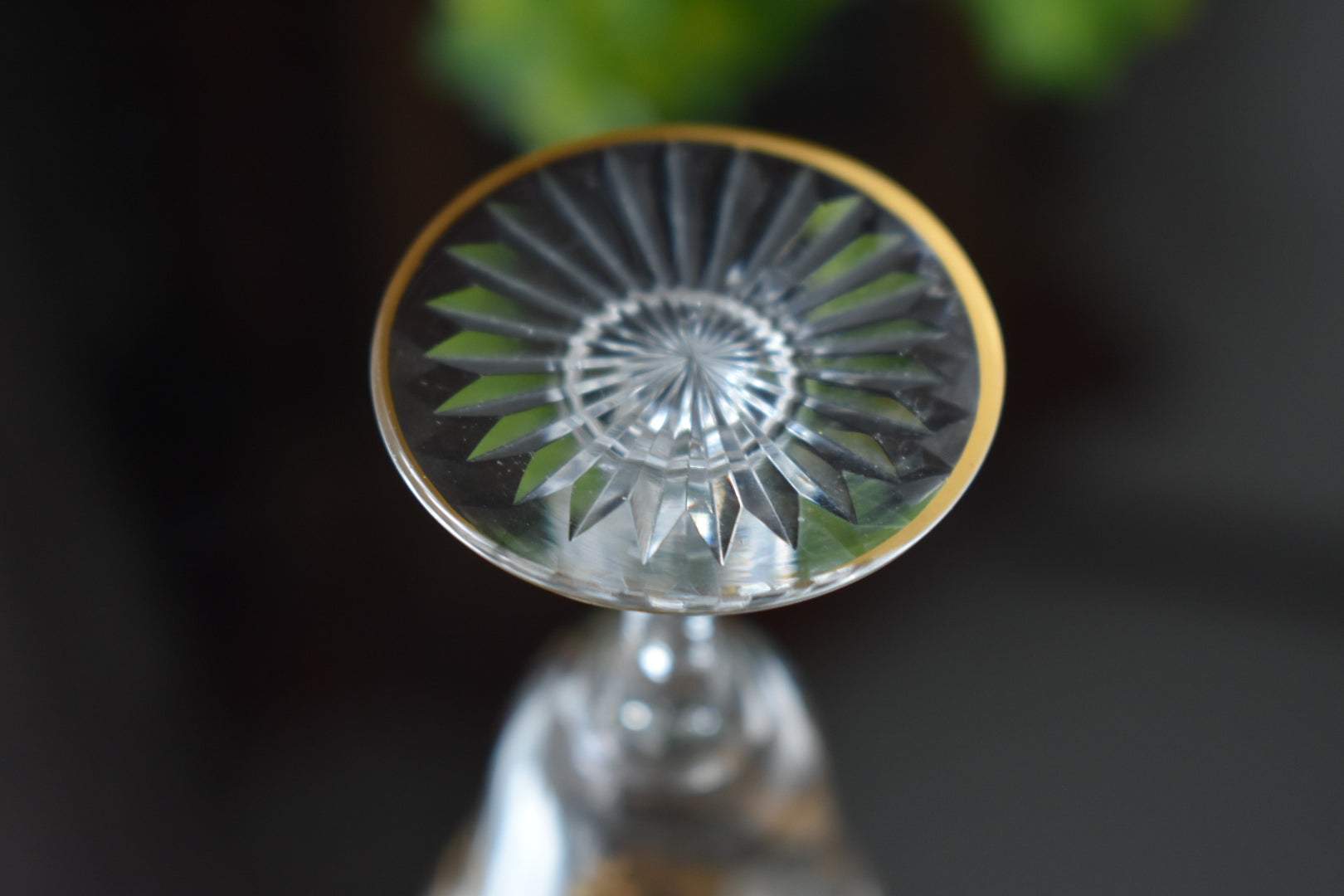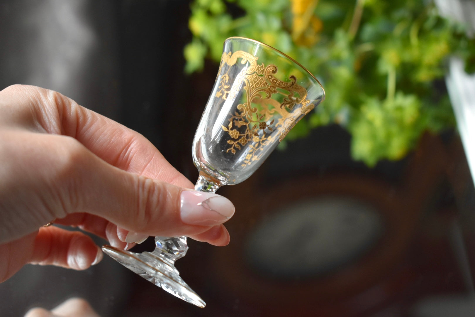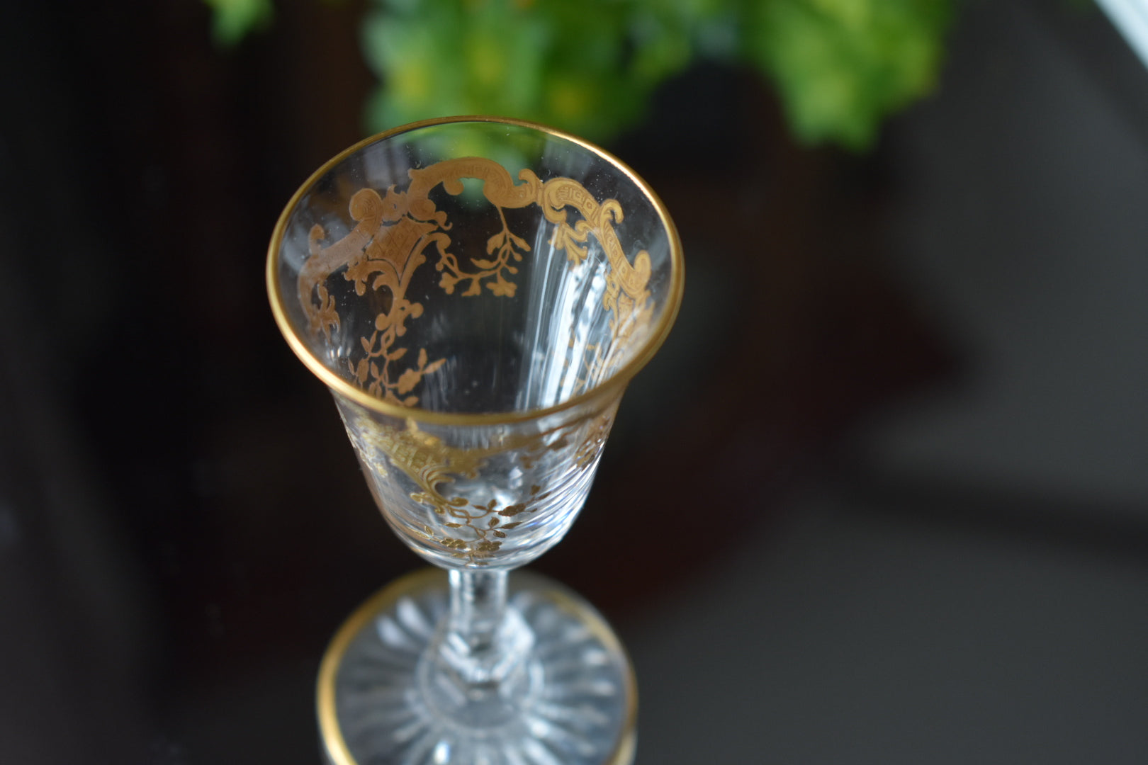 いかにもサンルイらしい、ステムに施された繊細なカッティングと金彩の装飾が美しいリキュールグラスです。