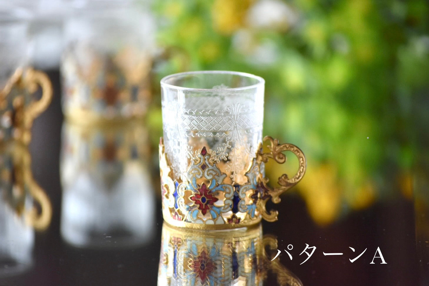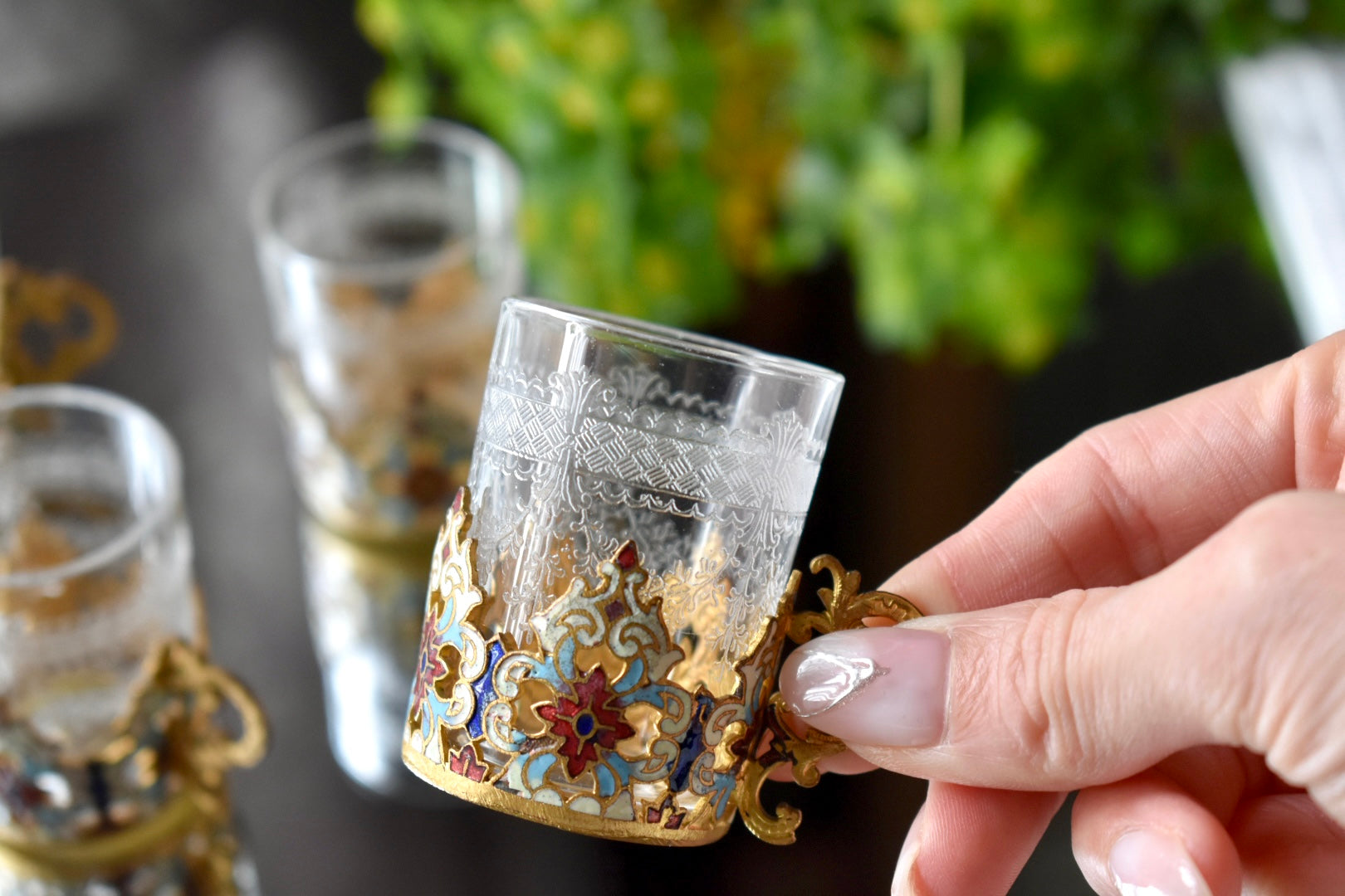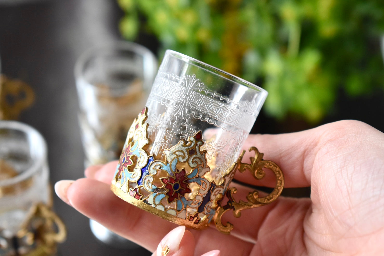 手に取ったとき、光を受けたときにその繊細な装飾が静かに存在感を放ち、グラス全体の完成度を高めています。