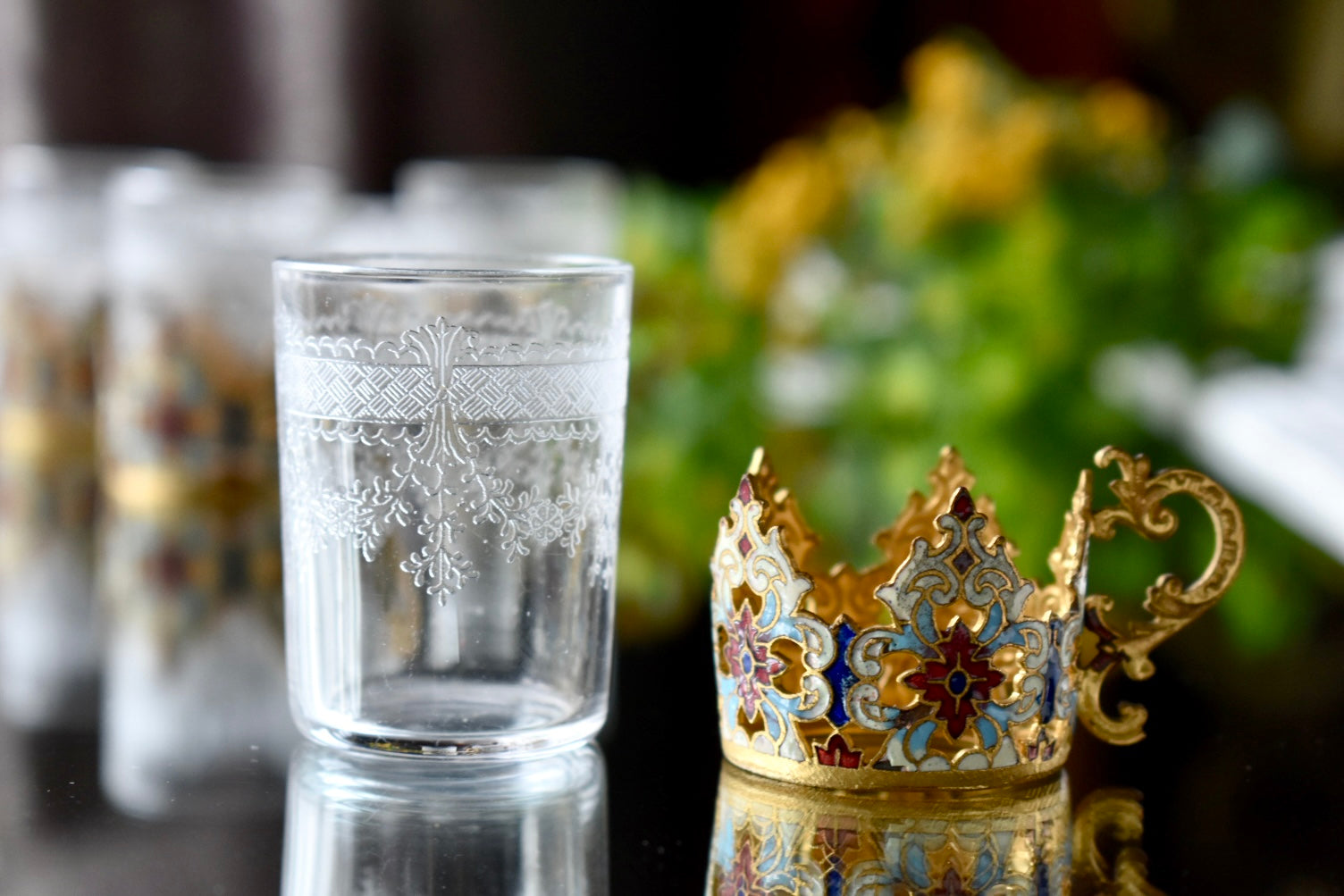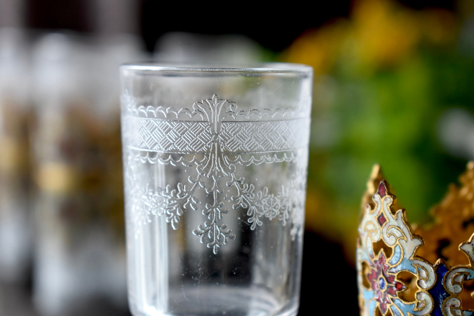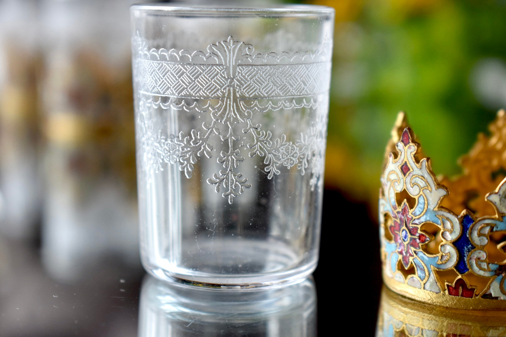 手に取ったとき、光を受けたときにその繊細な装飾が静かに存在感を放ち、グラス全体の完成度を高めています。
