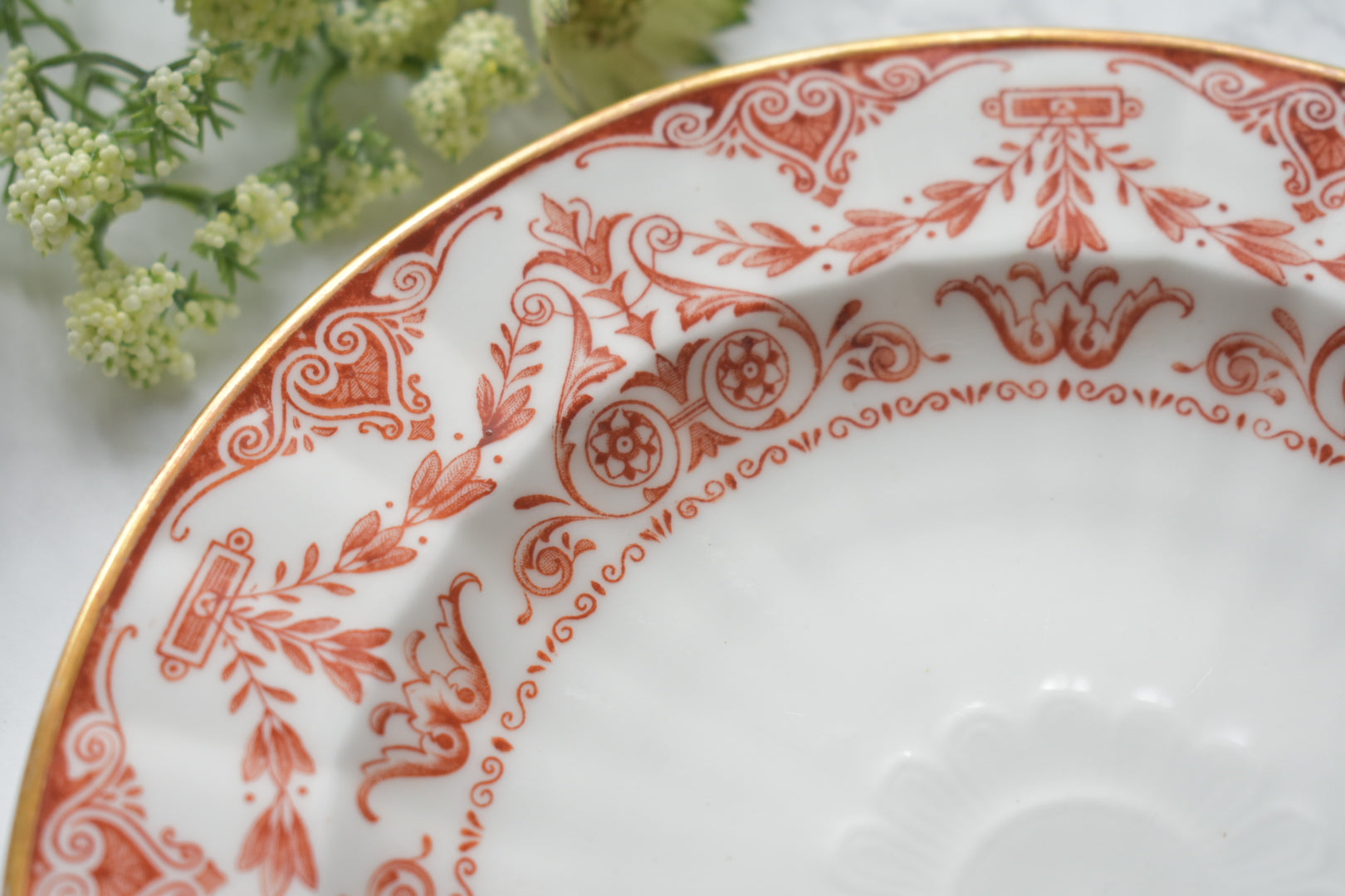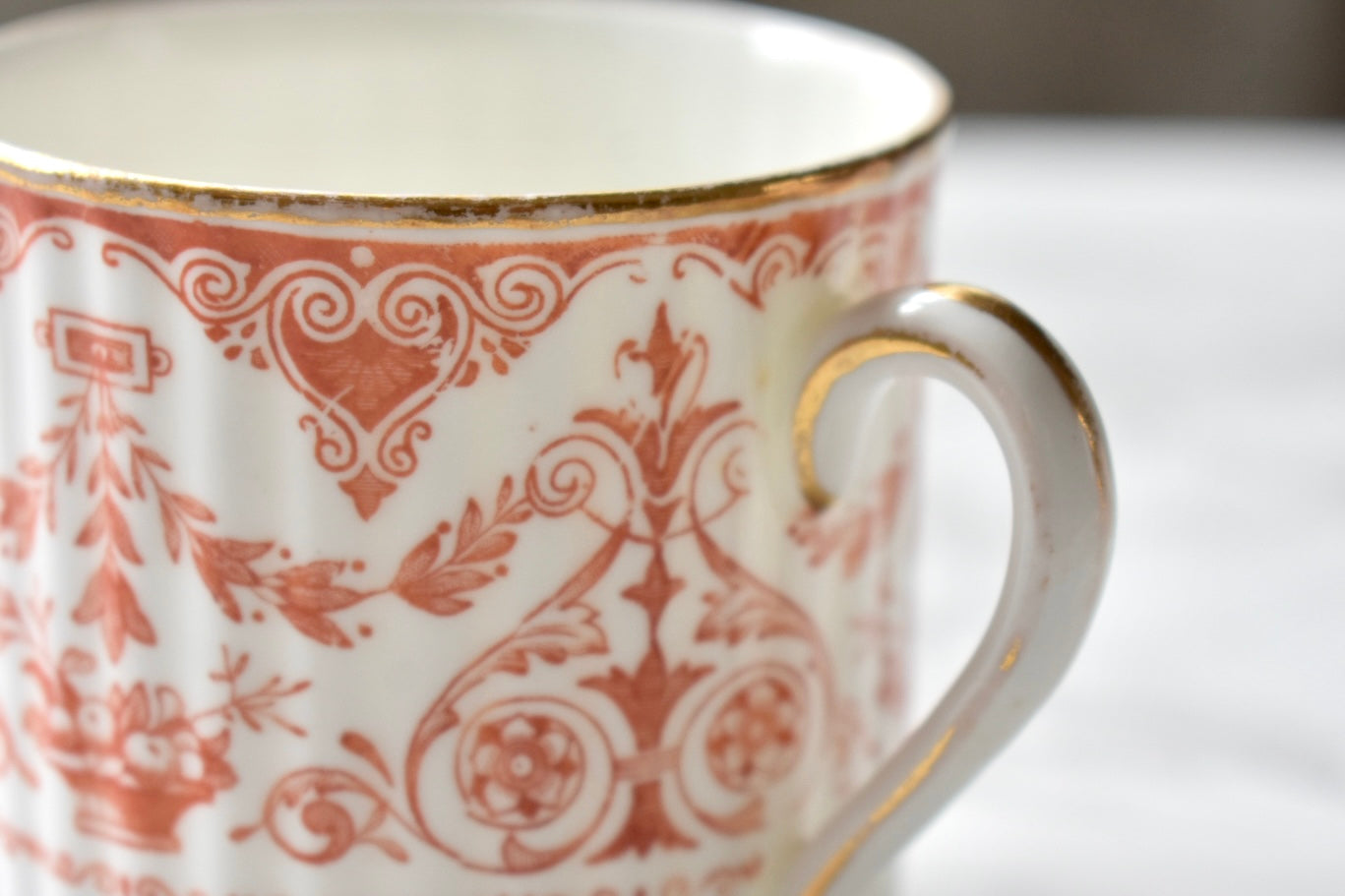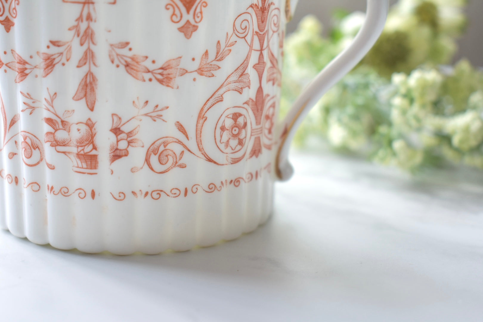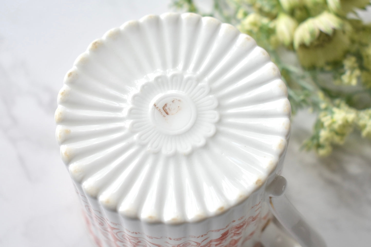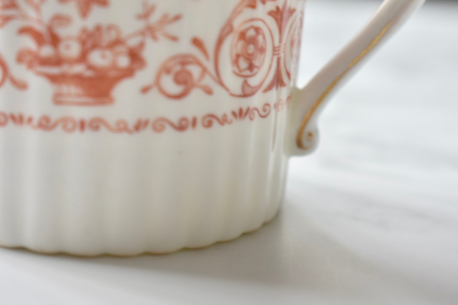 この装飾は、18〜19世紀のイギリスで発展した red transfer-printed ware(赤の転写印刷陶器) と呼ばれる技法によるものです。