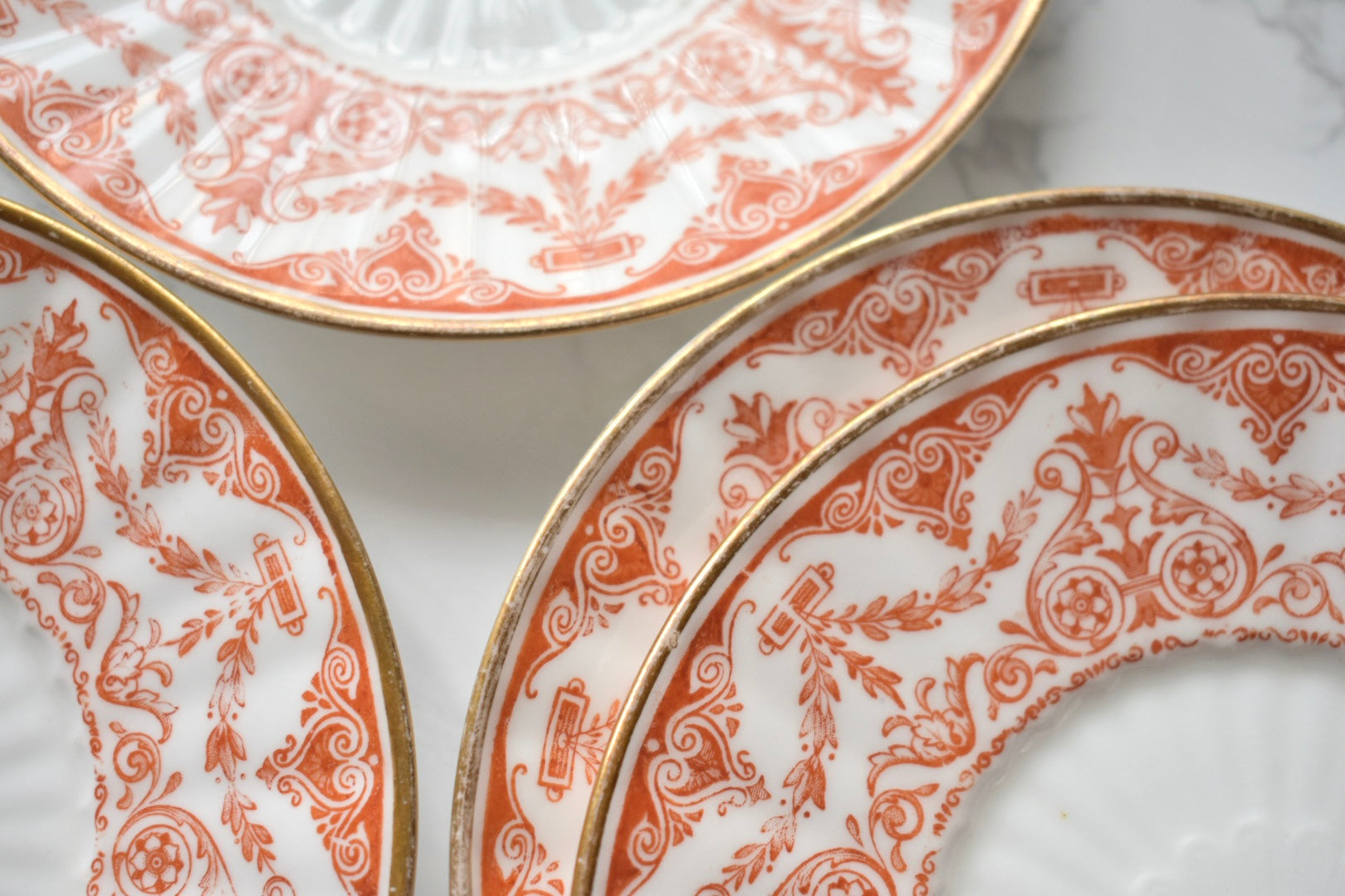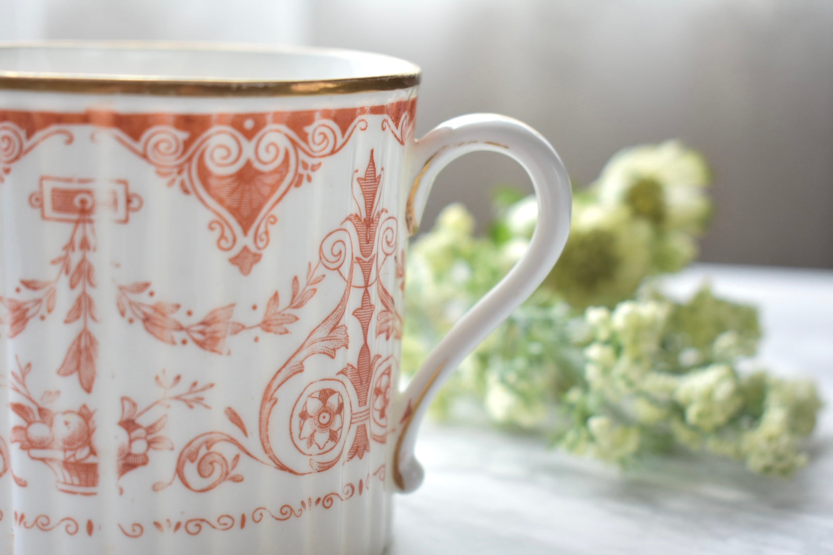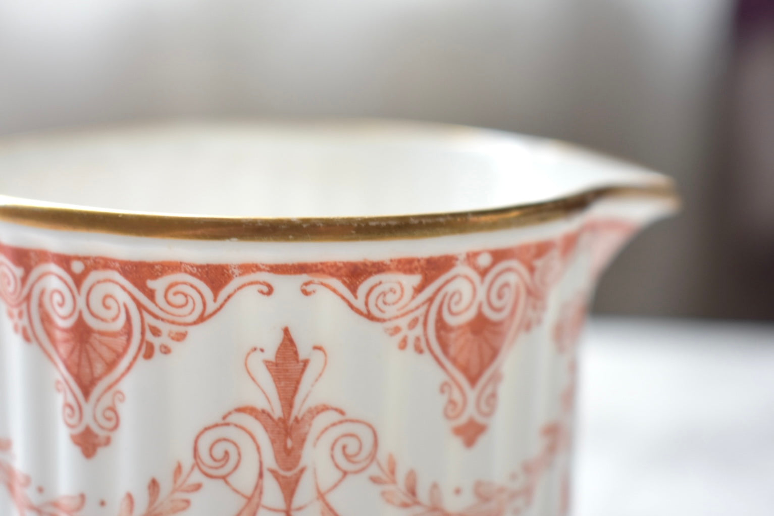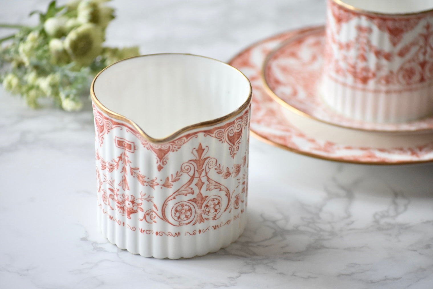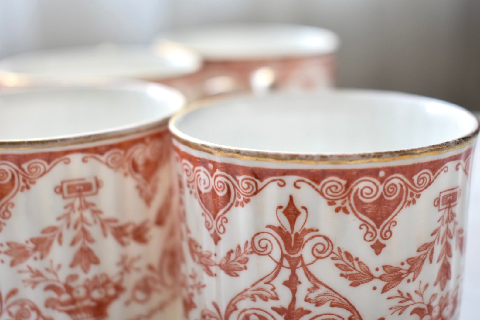 この装飾は、18〜19世紀のイギリスで発展した red transfer-printed ware(赤の転写印刷陶器) と呼ばれる技法によるものです。
