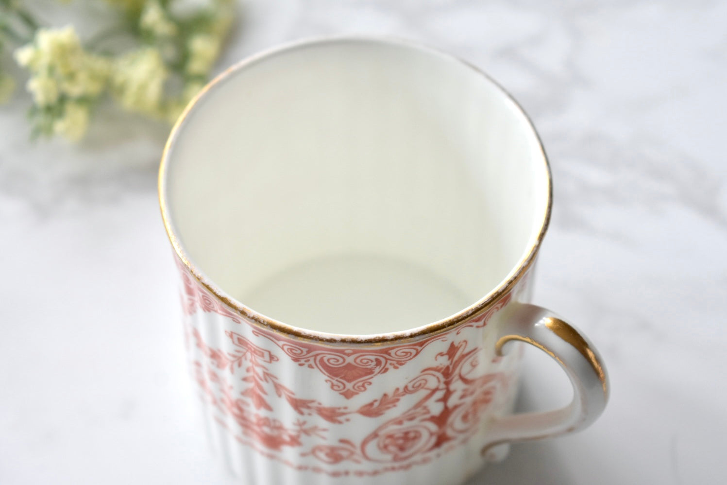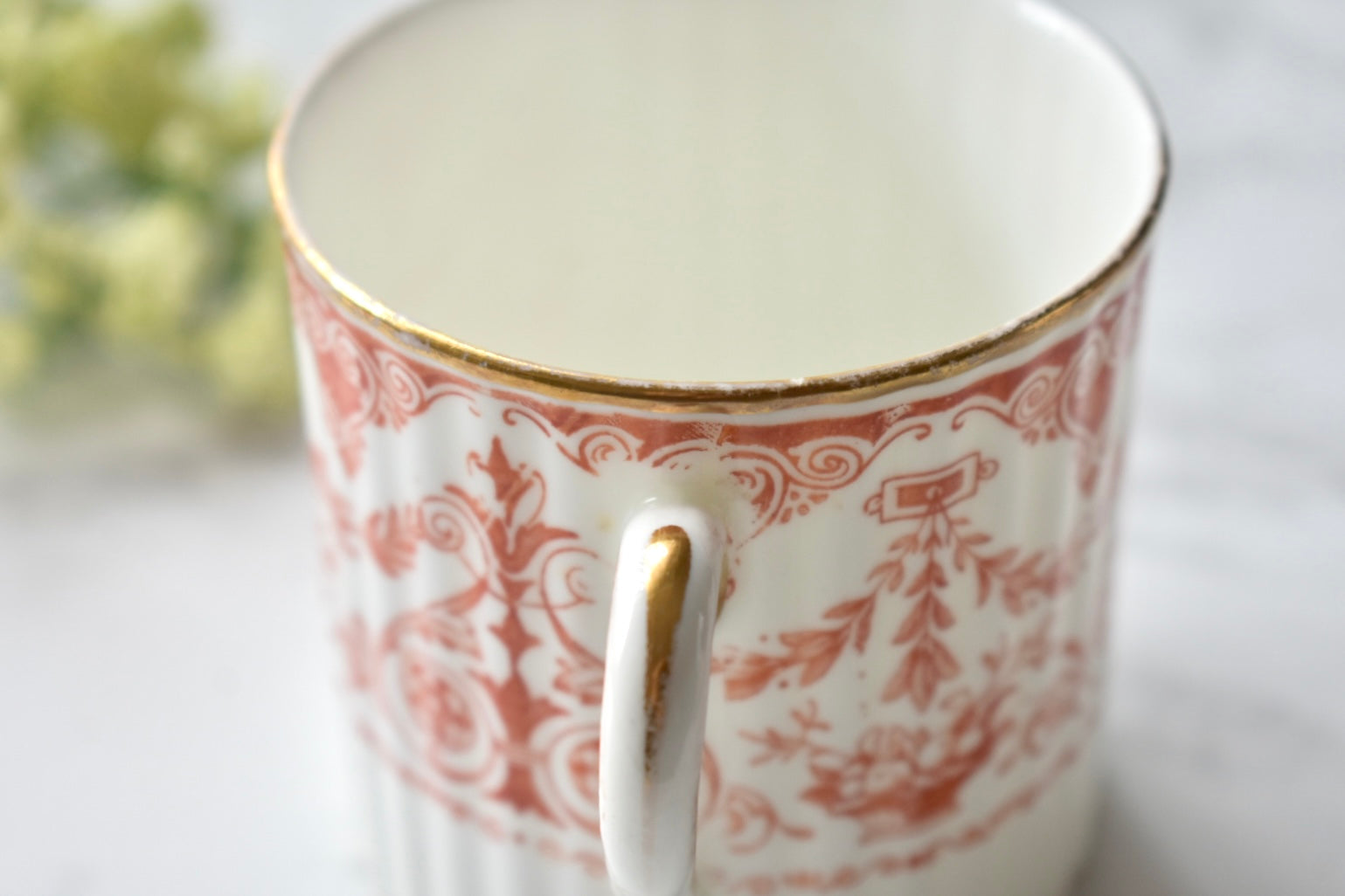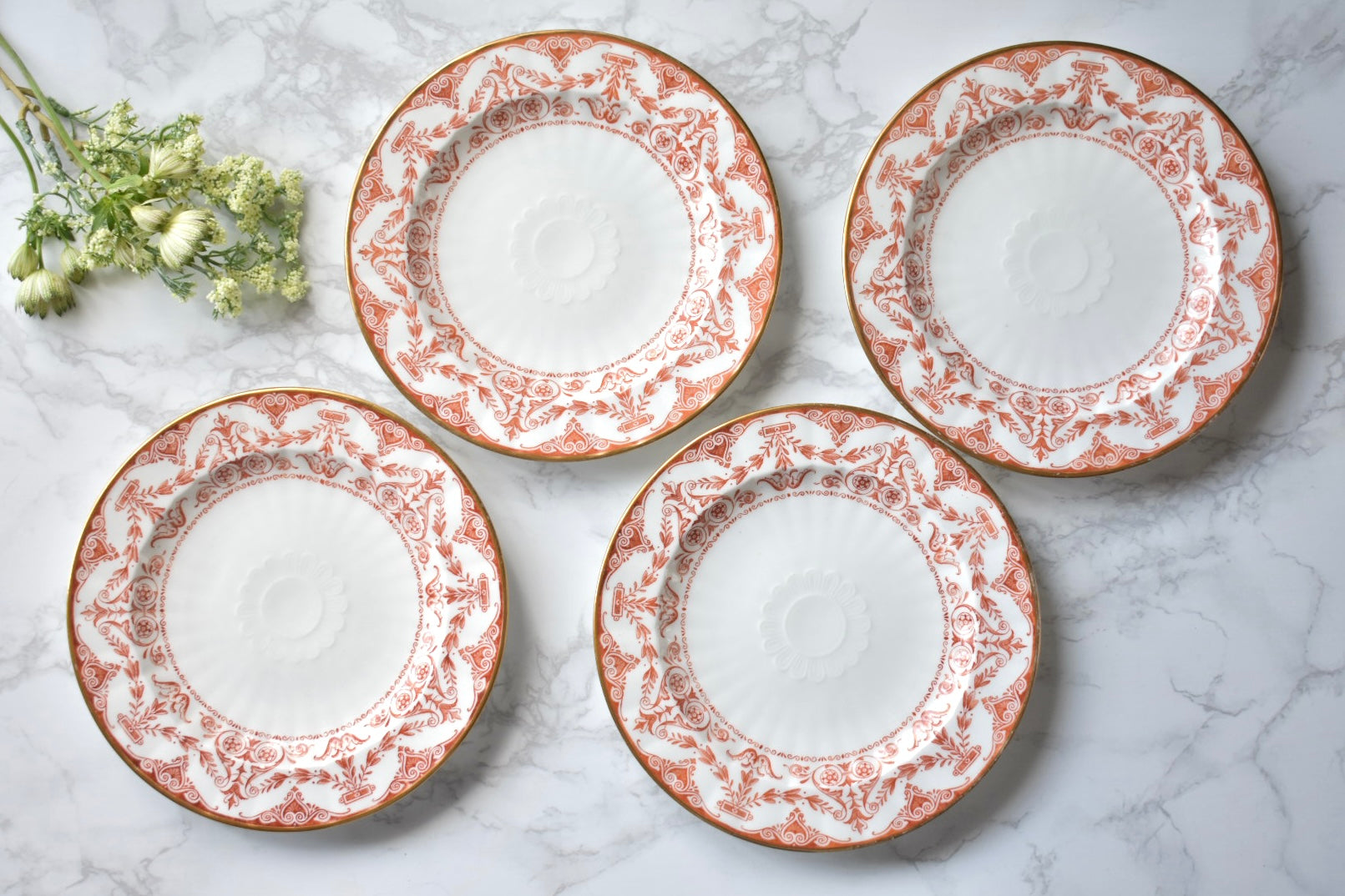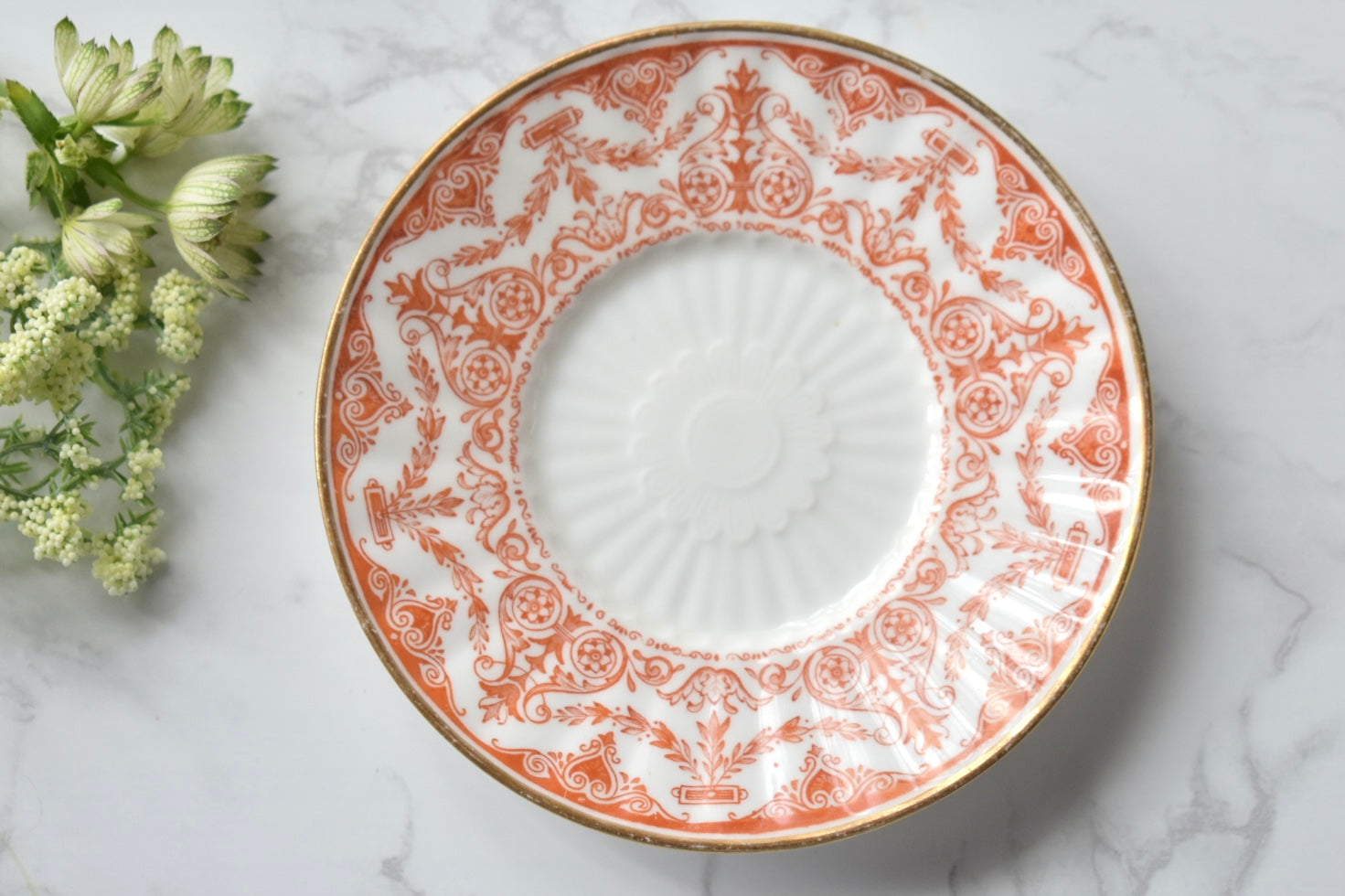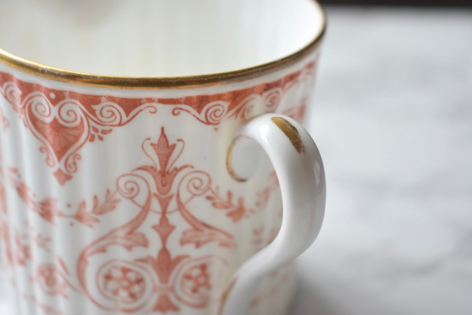 この装飾は、18〜19世紀のイギリスで発展した red transfer-printed ware(赤の転写印刷陶器) と呼ばれる技法によるものです。