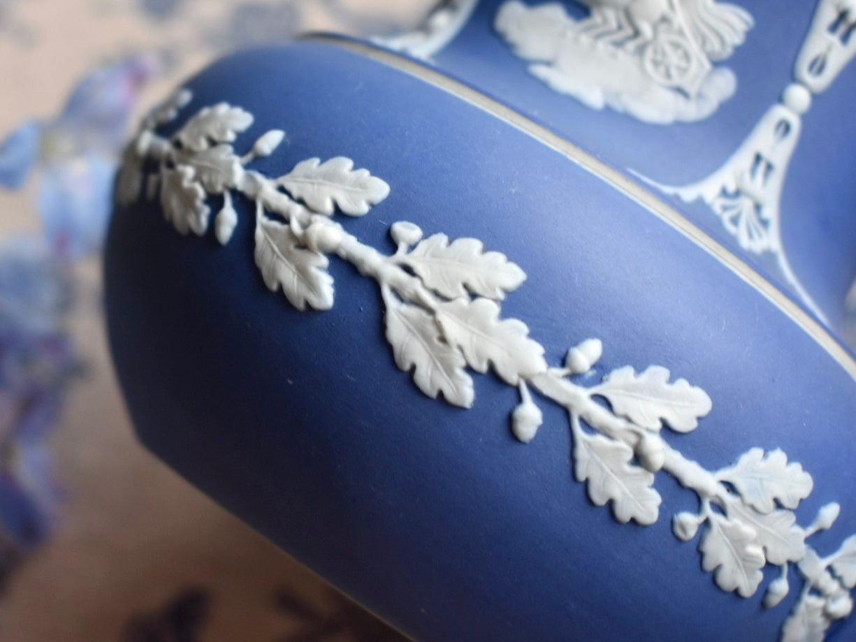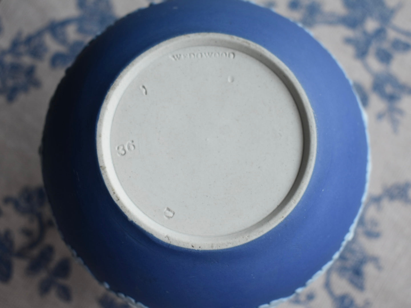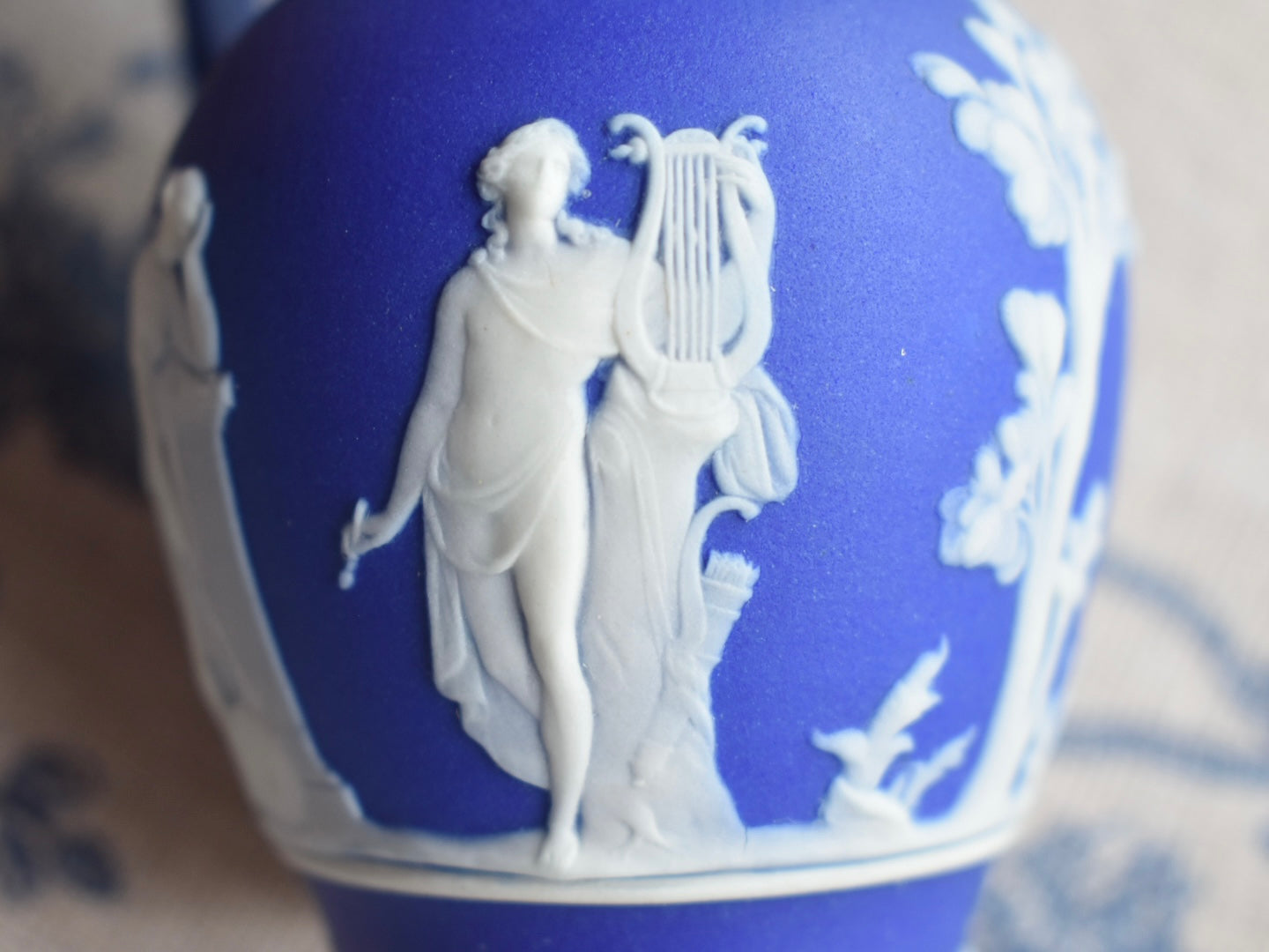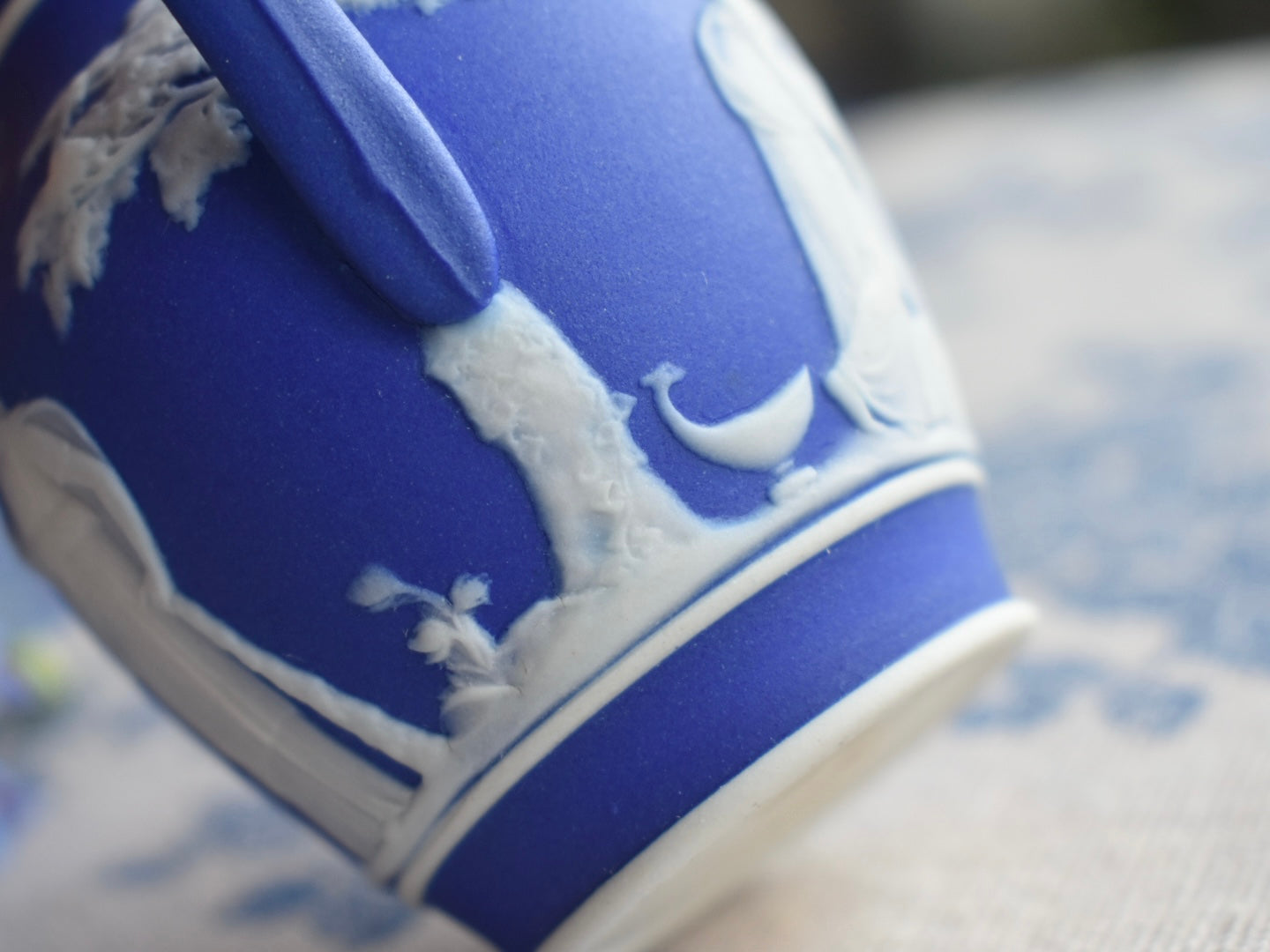 深みのあるロイヤルブルーの素地に、乳白色のレリーフが鮮やかなコントラストを描き出す姿は、ジャスパーウェアならではの気品を伝えています。